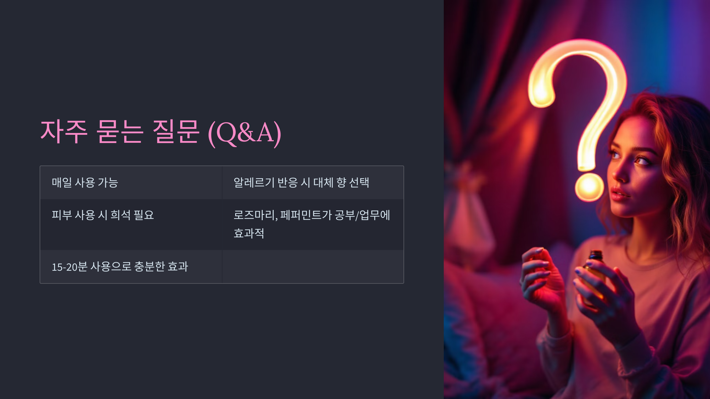 A5. 향기 오일은 후각을 통해 빠르게 영향을 주므로, 매일 15~20분 정도만 사용해도 충분한 효과를 볼 수 있습니다.