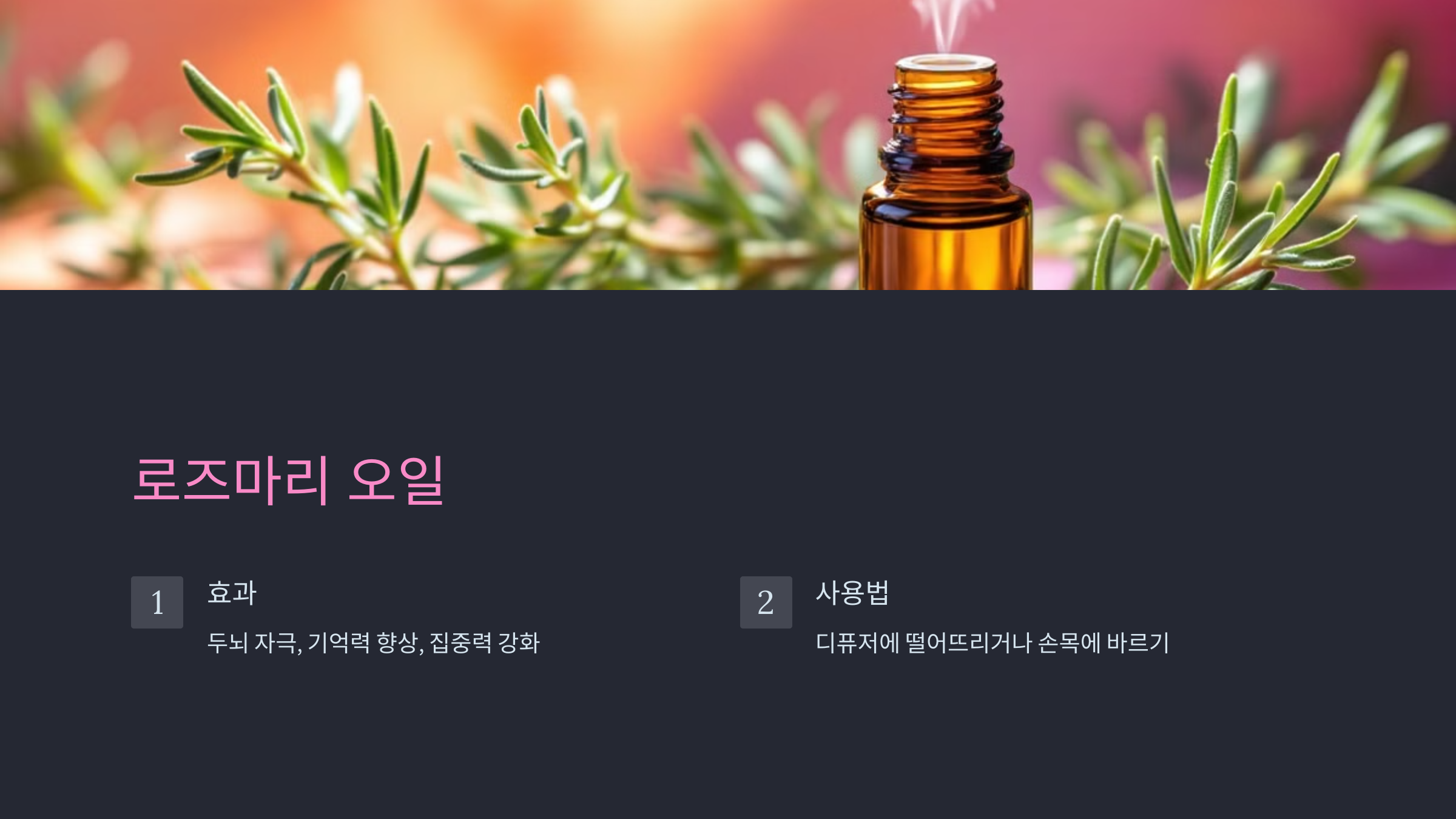 A4. 로즈마리와 페퍼민트 오일이 공부와 업무에 가장 효과적입니다. 두뇌 자극과 집중력 향상에 좋은 효과가 있습니다.