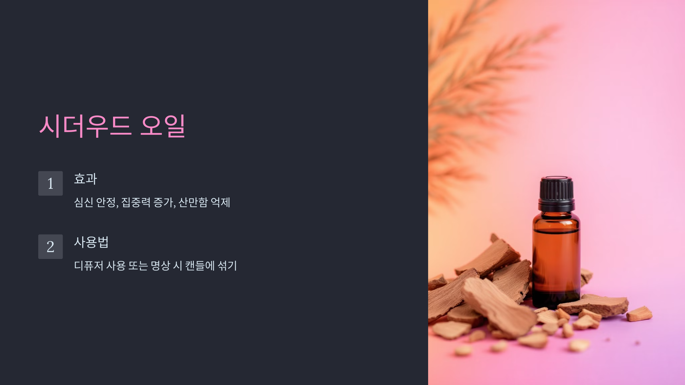 - 사용법: 디퓨저에 넣어 방 안에 향기를 퍼뜨리거나, 명상 전 캔들에 섞어 사용합니다.