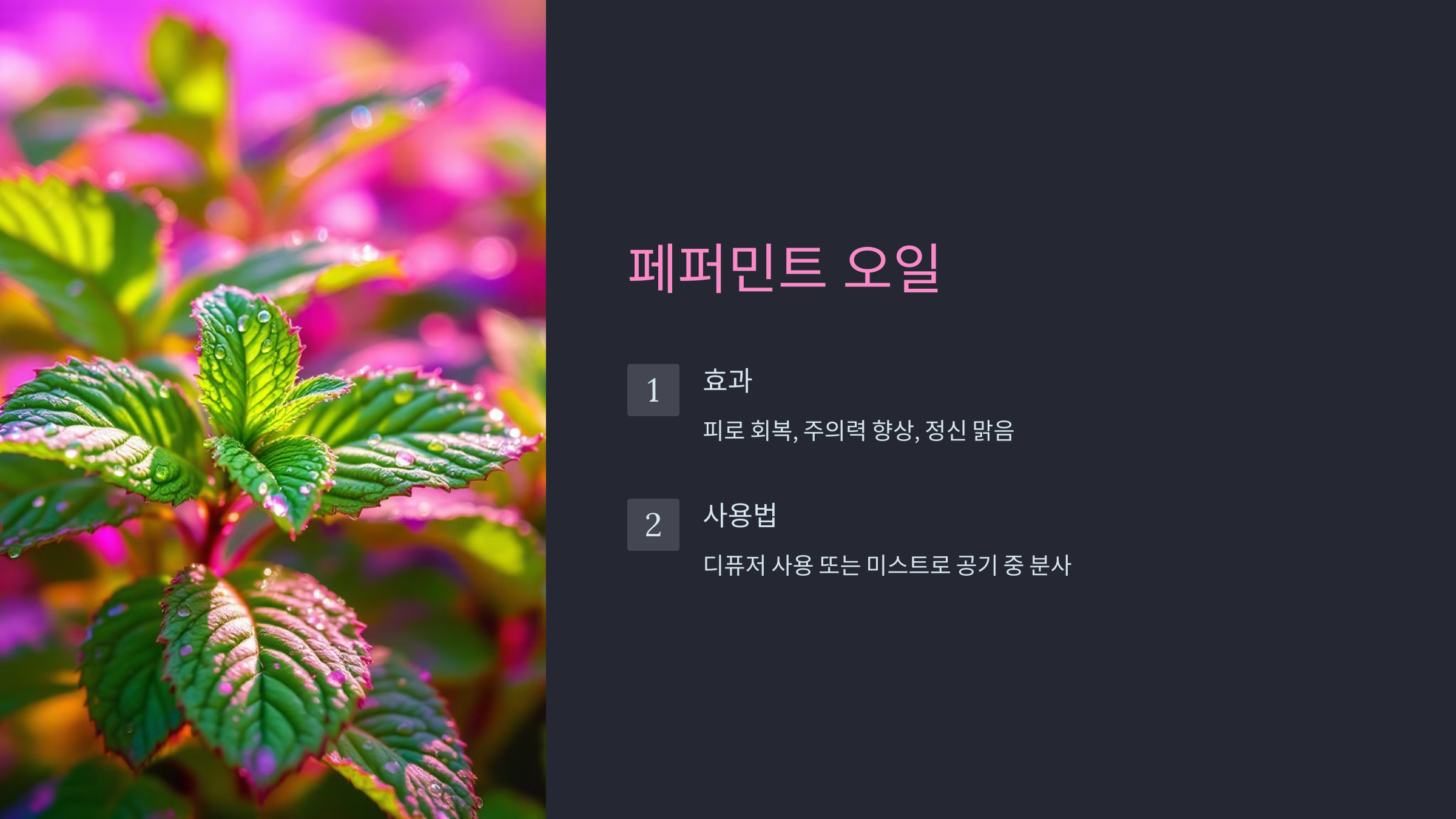 페퍼민트는 정신을 맑게 하고 에너지를 회복시켜주는 상쾌한 향이 특징입니다. 피로를 덜어주고 산뜻한 기운을 줘서 주의력과 집중력을 높이는 데 유용합니다. 특히 오후 시간대 피곤함을 느낄 때 사용하면 좋은 효과를 볼 수 있습니다.