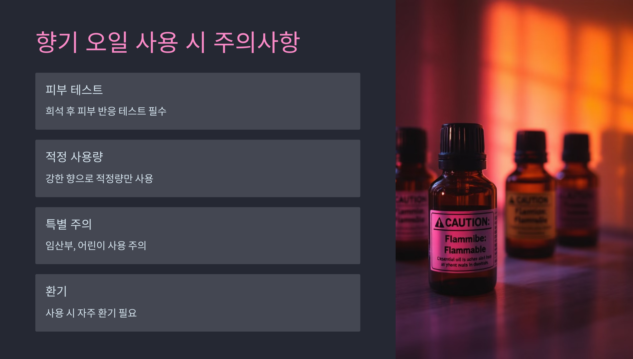 - 임산부 및 어린이 주의: 특정 오일은 임산부와 어린이에게 적합하지 않을 수 있으니 주의해야 합니다.