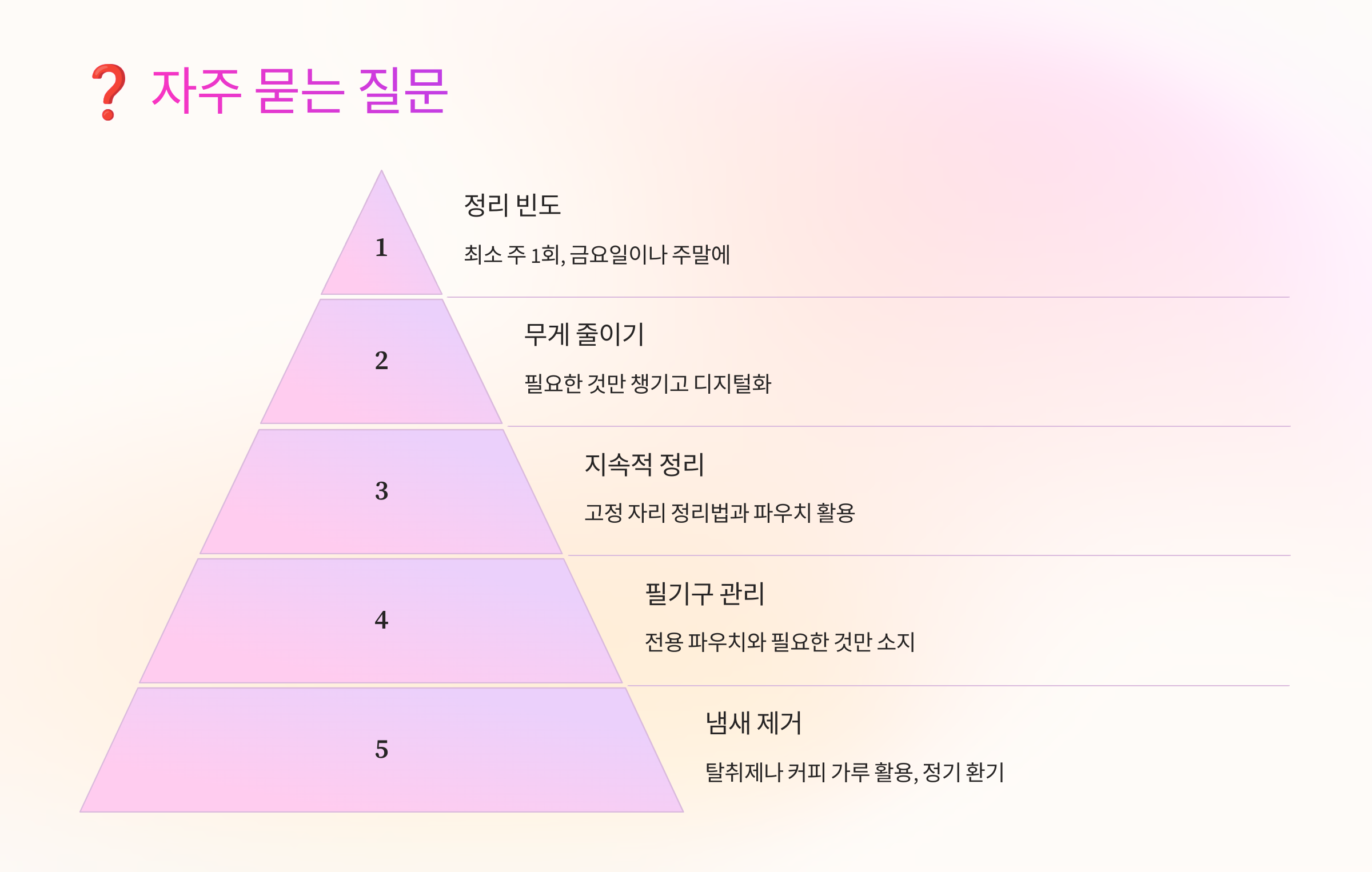 A1. 매일 가방을 정리하면 가장 좋지만, 최소한 일주일에 한 번은 정리하는 것이 좋아요. 금요일이나 주말에 가방을 정리하고 불필요한 물건을 빼면 다음 주를 더 효율적으로 시작할 수 있어요! 😊