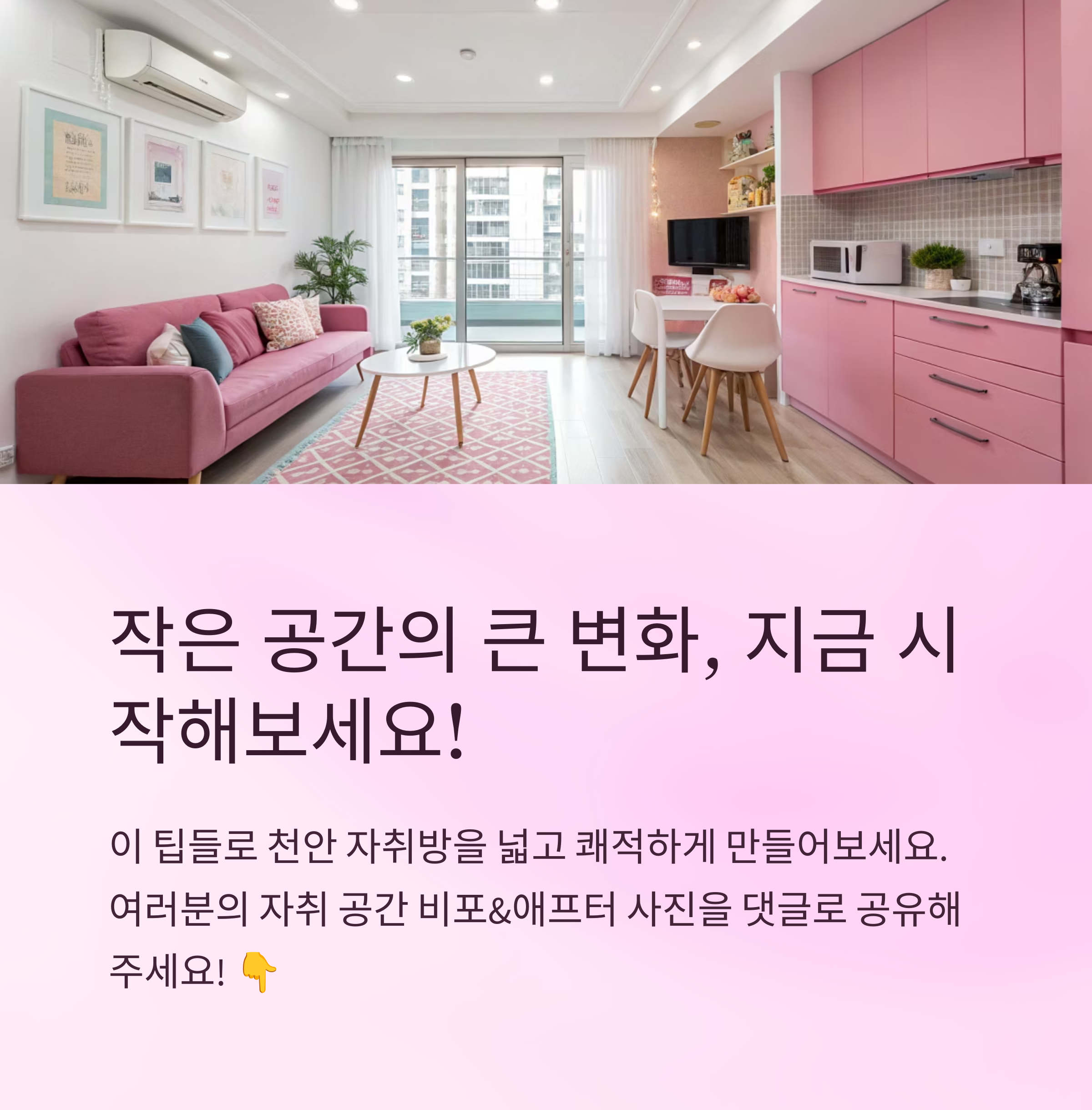 공간을 넓어 보이게 꾸미는 것도 중요하지만, 그보다 더 중요한 건 ‘유지’예요. 아무리 예쁘게 꾸며놔도 정리하지 않고, 물건이 쌓이면 금세 다시 답답해지기 마련이죠. 천안 자취방에서 쾌적한 생활을 유지하고 싶다면 꾸준한 습관이 가장 큰 무기예요!