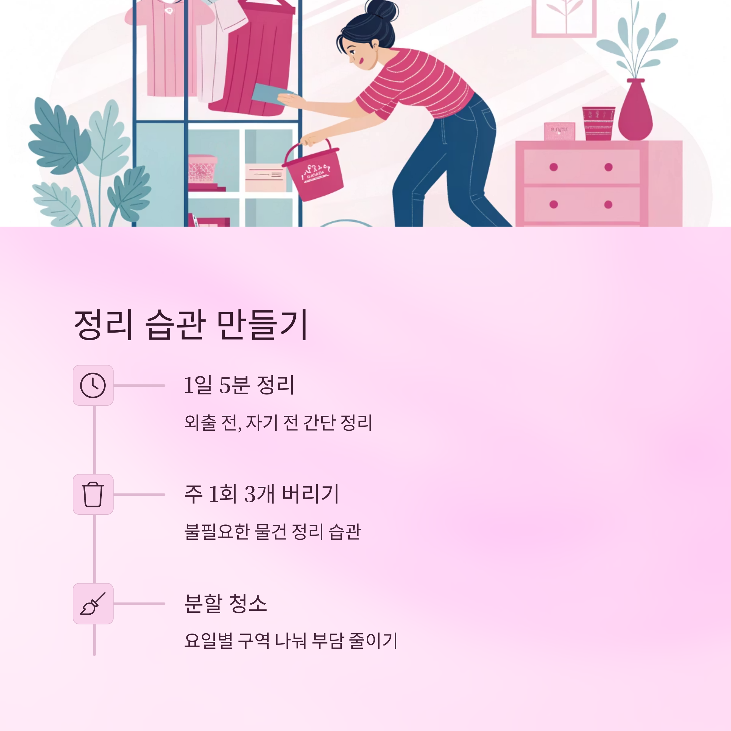 | 1일 5분 정리 | 매일 | 공간 유지, 심리적 안정감 |