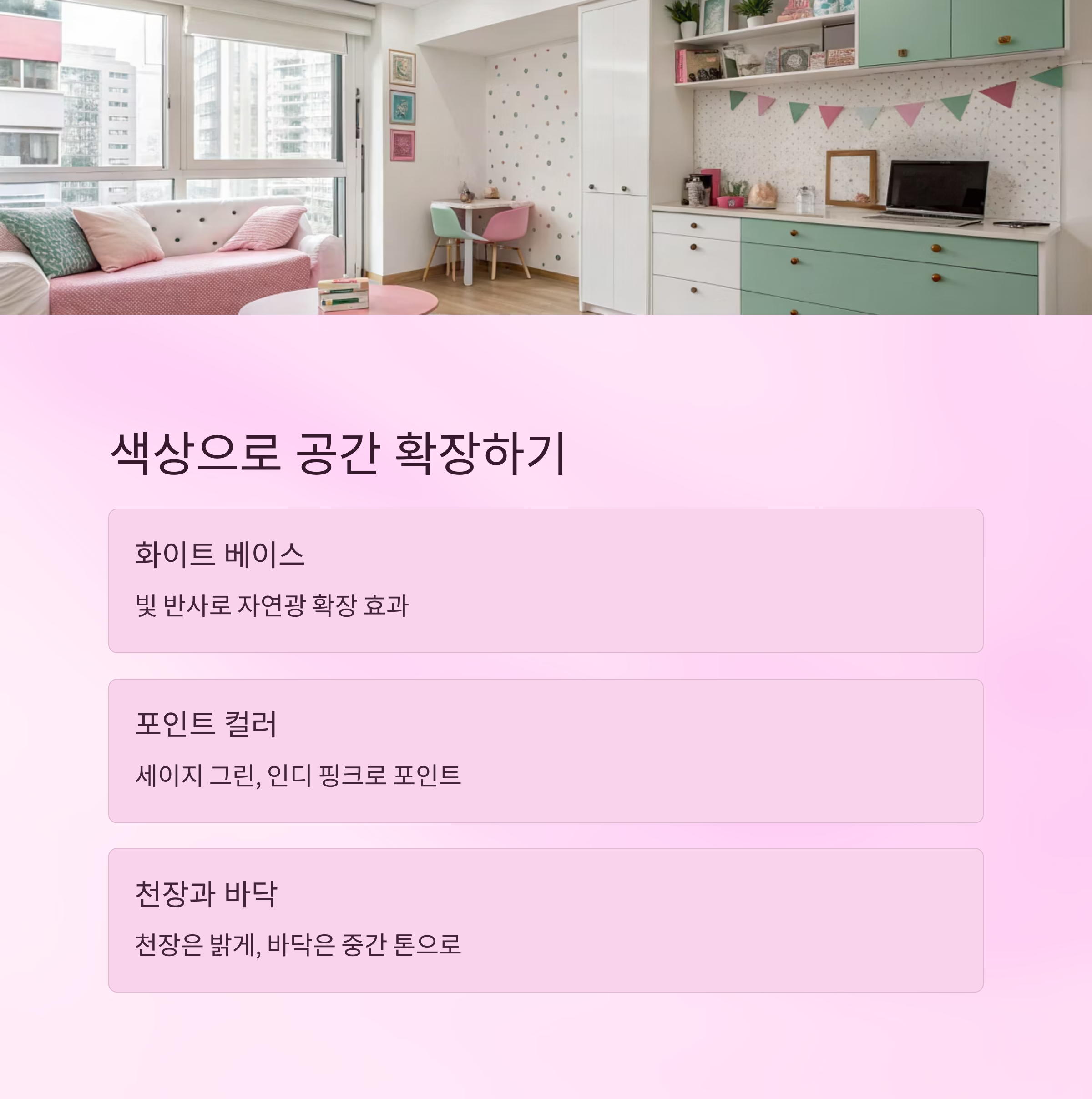 A2. 밝은 베이스(화이트, 크림) + 은은한 포인트 컬러(세이지그린, 인디핑크)가 공간을 넓어 보이게 해줘요.