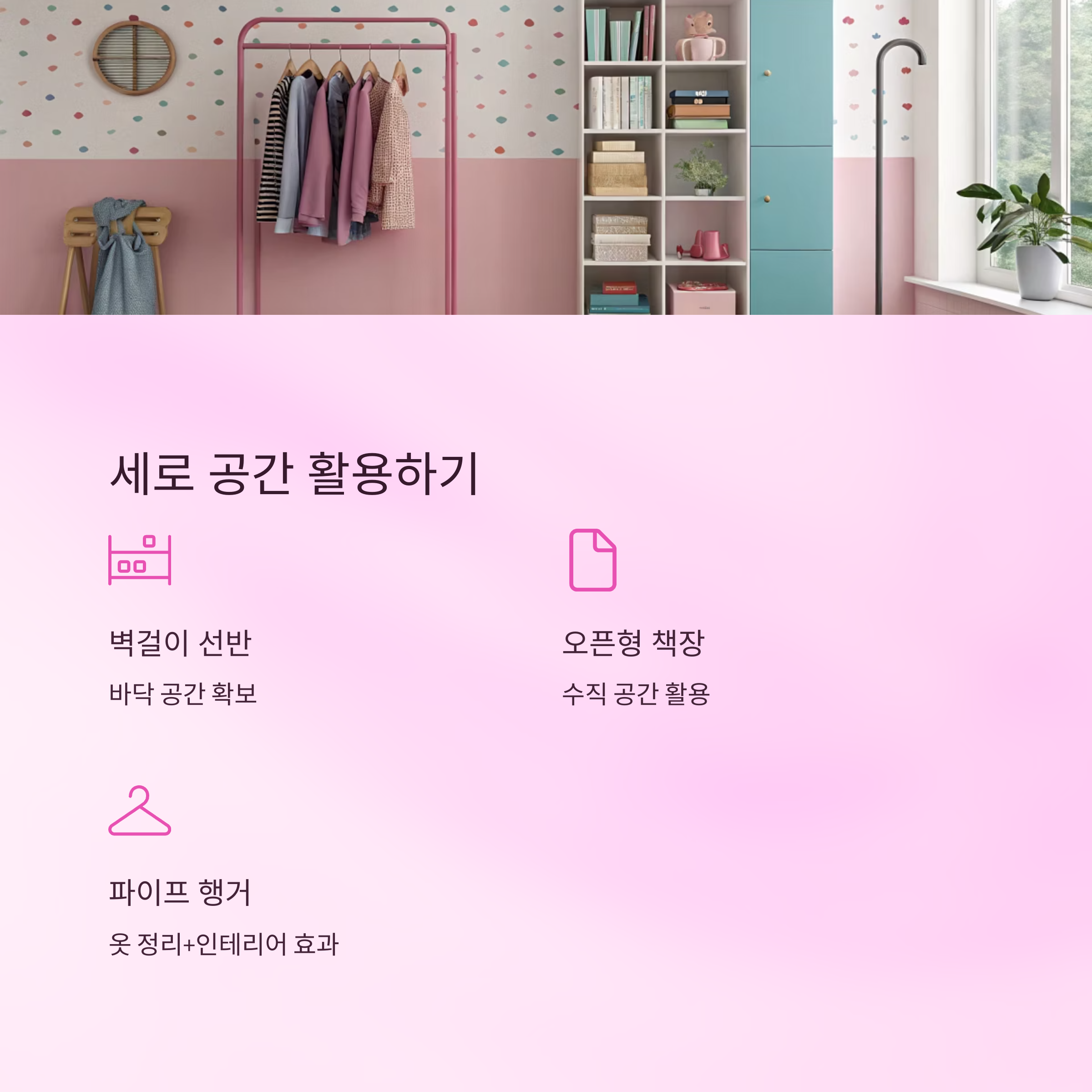 | 벽걸이 선반 | 책, 장식품 수납 가능 | 바닥 비우고 시야 확장 |