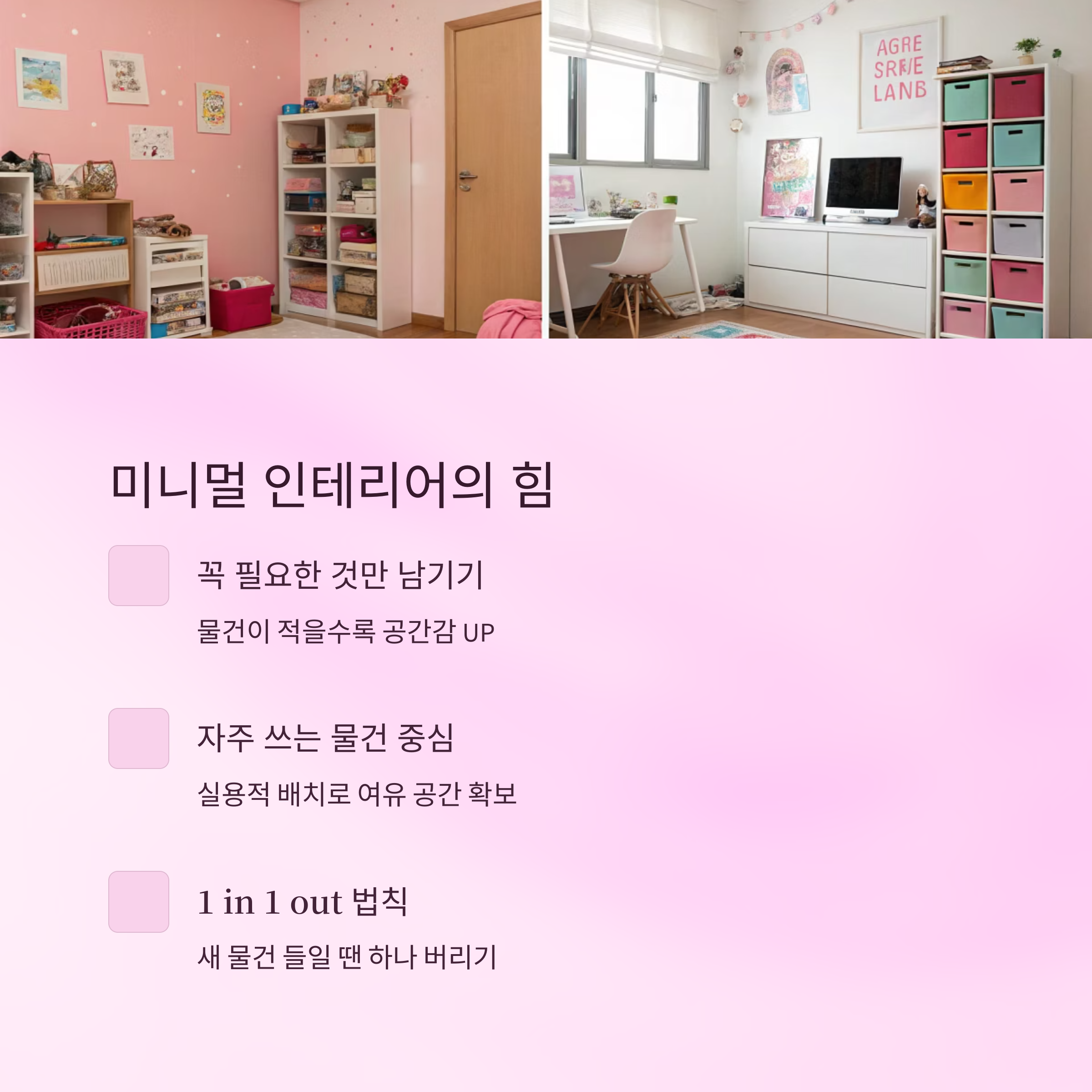 자취방을 넓어 보이게 하는 건 단순히 ‘꾸미는 기술’이 아니에요. 꾸준히 정리하고, 불필요한 것을 줄이려는 습관에서 시작해요. 한 번 정해둔 자리를 지키는 것만으로도 방은 훨씬 여유 있어지고, 내 마음도 정리되는 걸 느낄 수 있어요. ✨