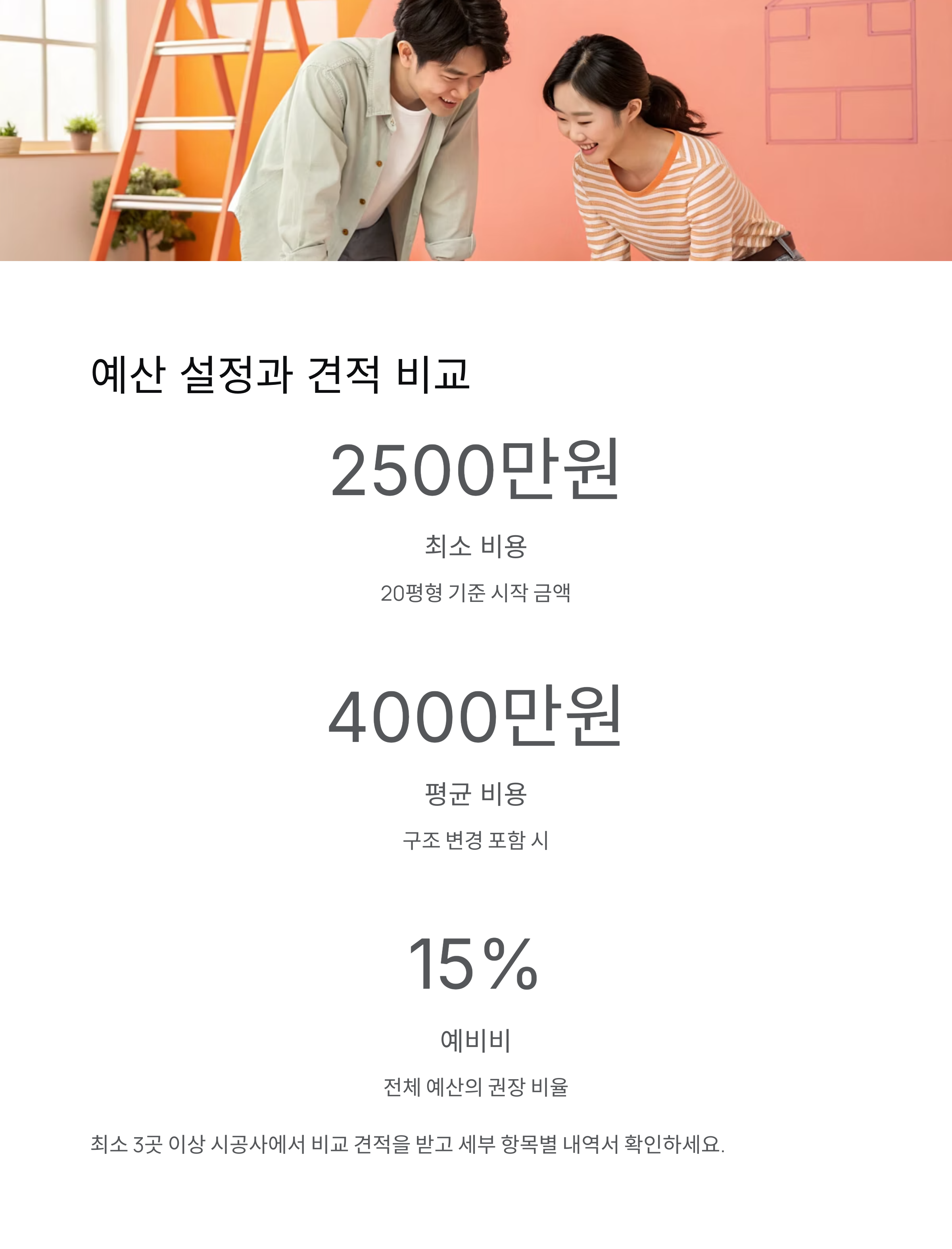A1. 평균적으로 20평형 기준 2500만 원~4000만 원 사이이며, 구조공사 포함 시 더 증가해요.