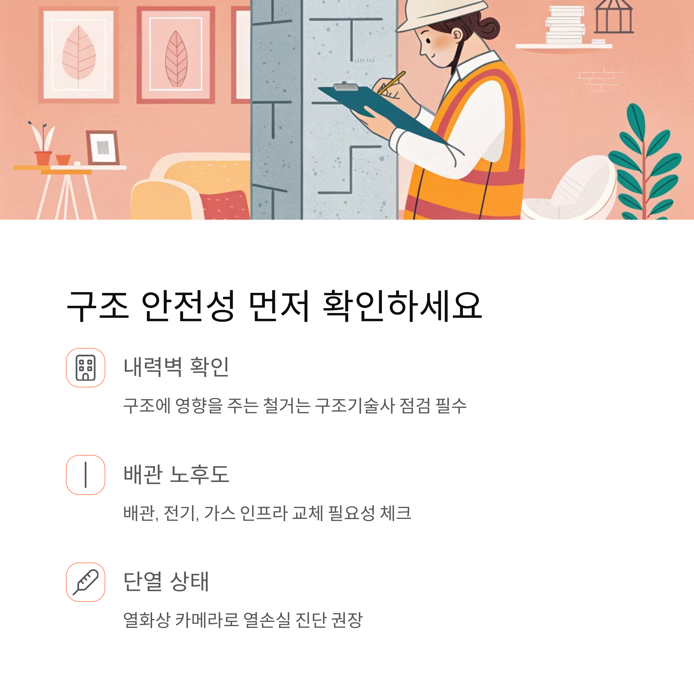 리모델링 전에 반드시 먼저 확인해야 할 부분은 바로 ‘구조 안전성’이에요. 특히 지은 지 20년이 넘은 빌라의 경우, 골조나 슬래브 상태가 손상되어 있는 경우가 많거든요. 구조에 영향을 주는 철거는 무작정 하면 절대 안 되고, 반드시 구조기술사의 점검이 선행되어야 해요.