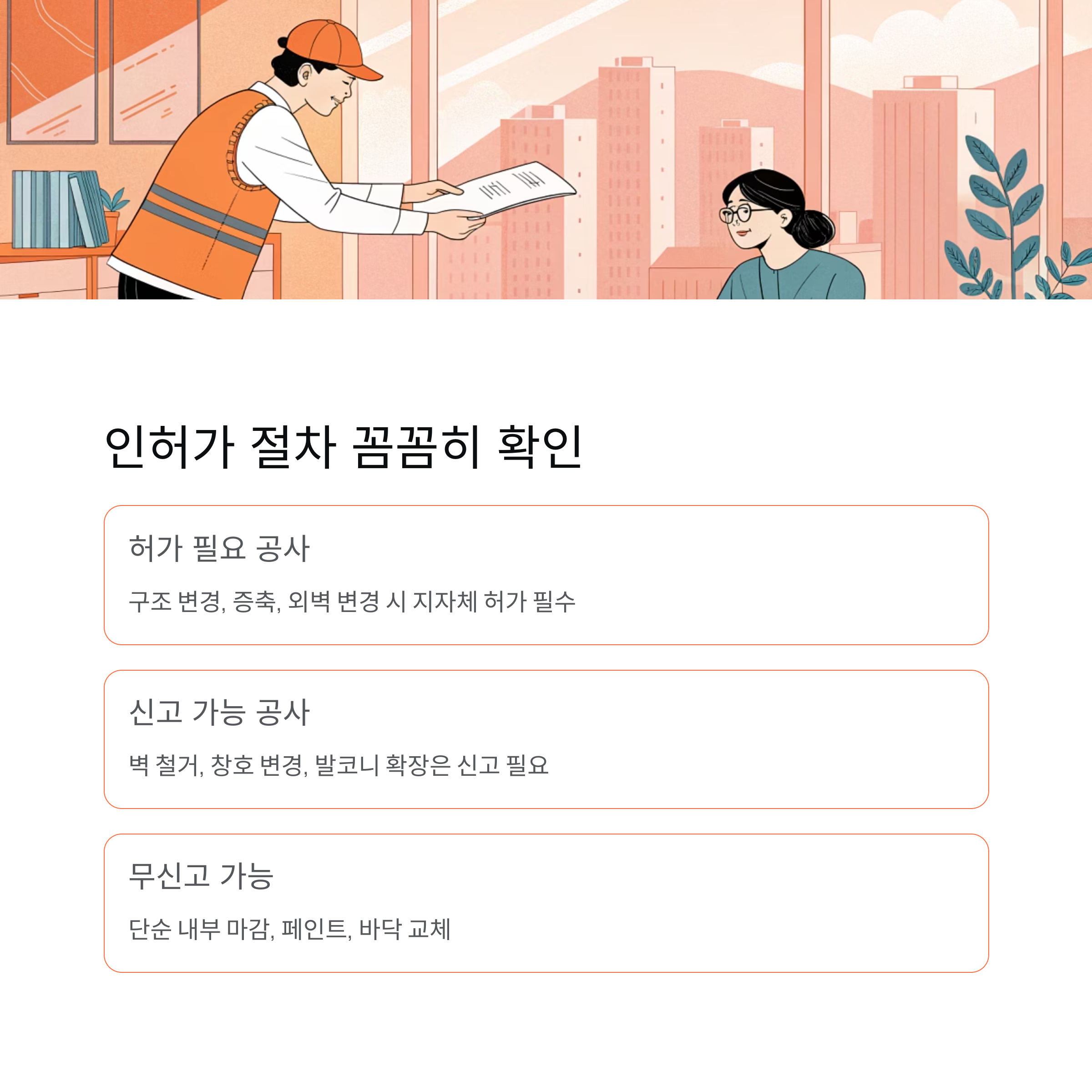 단순 내부 인테리어나 마감재 교체는 신고 없이도 가능하지만, 벽 철거, 창호 변경, 발코니 확장 등의 작업은 해당 구청 건축과에 신고 또는 허가 절차를 거쳐야 해요. 무단 공사 시 원상복구 명령과 벌금이 부과될 수 있어서 주의가 필요해요.