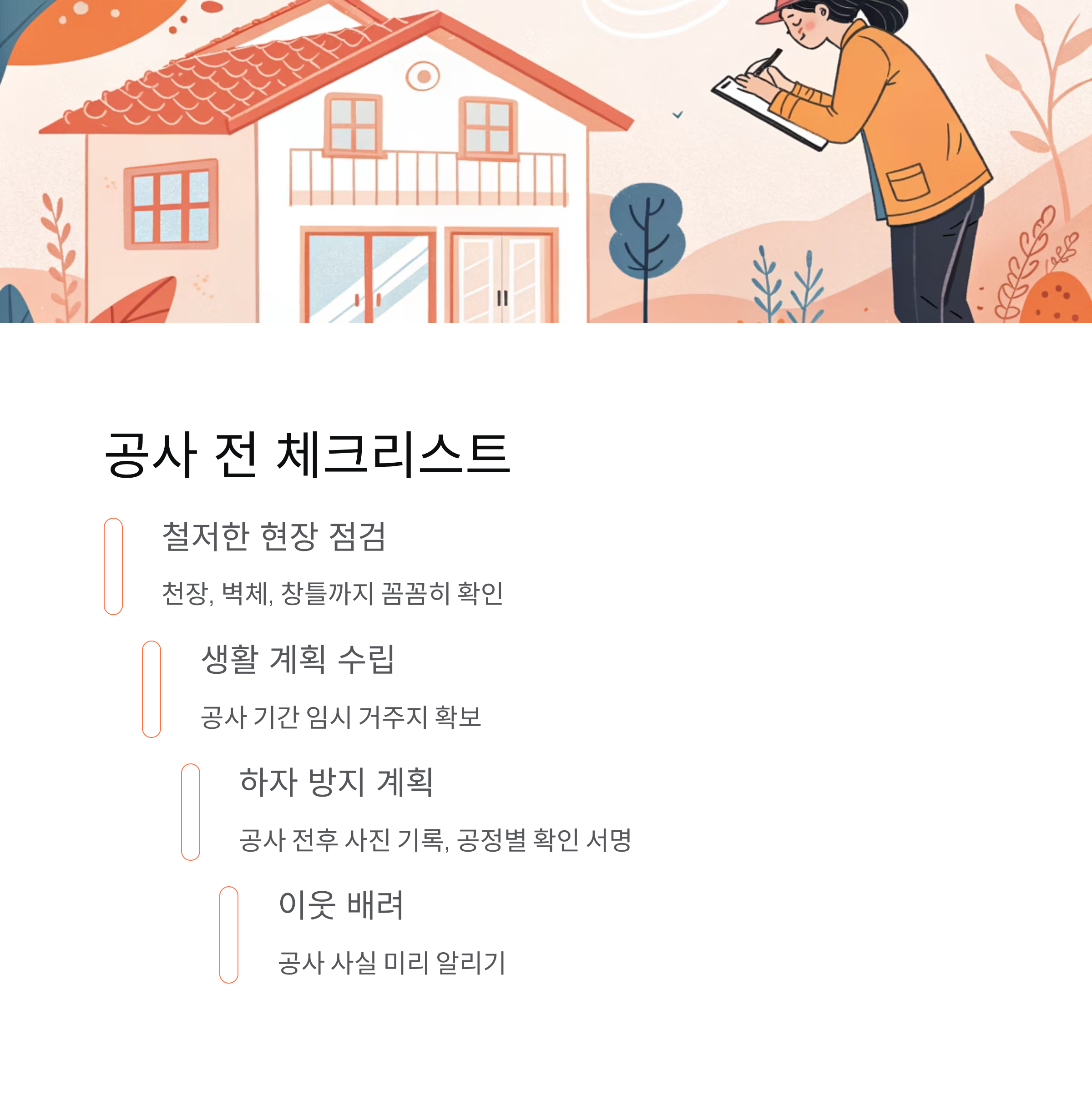 세 번째는 ‘하자 방지 계획’이에요. 공사 전후 사진을 반드시 남기고, 공정마다 확인하고 서명하는 절차를 갖추는 게 좋아요. 또한 하자 발생 시 연락할 수 있는 담당자 정보를 계약서에 명시하는 것도 잊지 말아야 해요.
