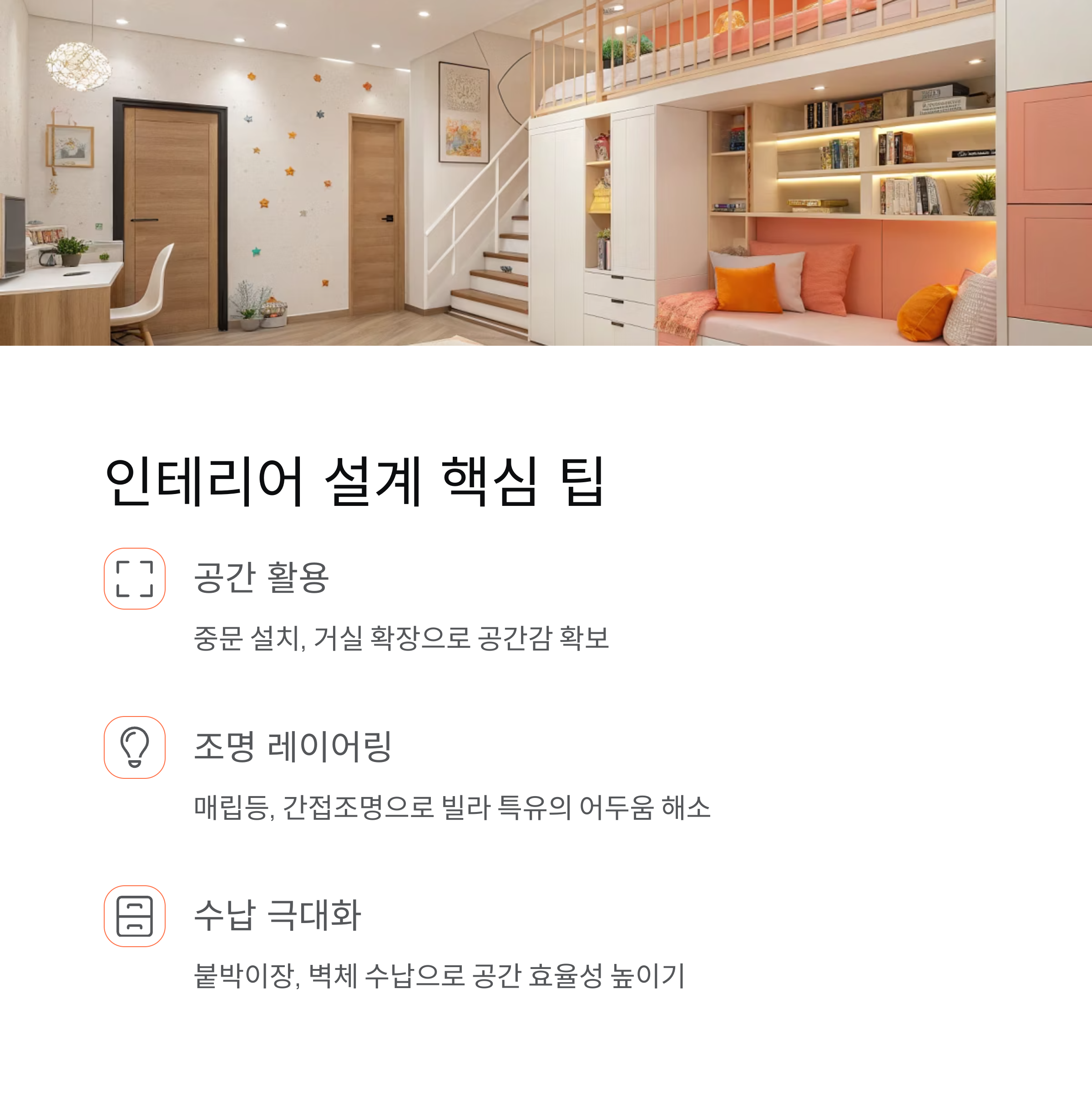 공간감을 살리기 위해서는 ‘화이트+우드’ 조합이 가장 무난하면서도 고급스러운 느낌을 줄 수 있어요. 조명도 중요해요! 매립등, 간접조명을 활용하면 빌라 특유의 어두운 느낌을 줄일 수 있어요. 특히 거실과 주방의 조명은 레이어링 조명이 좋아요.