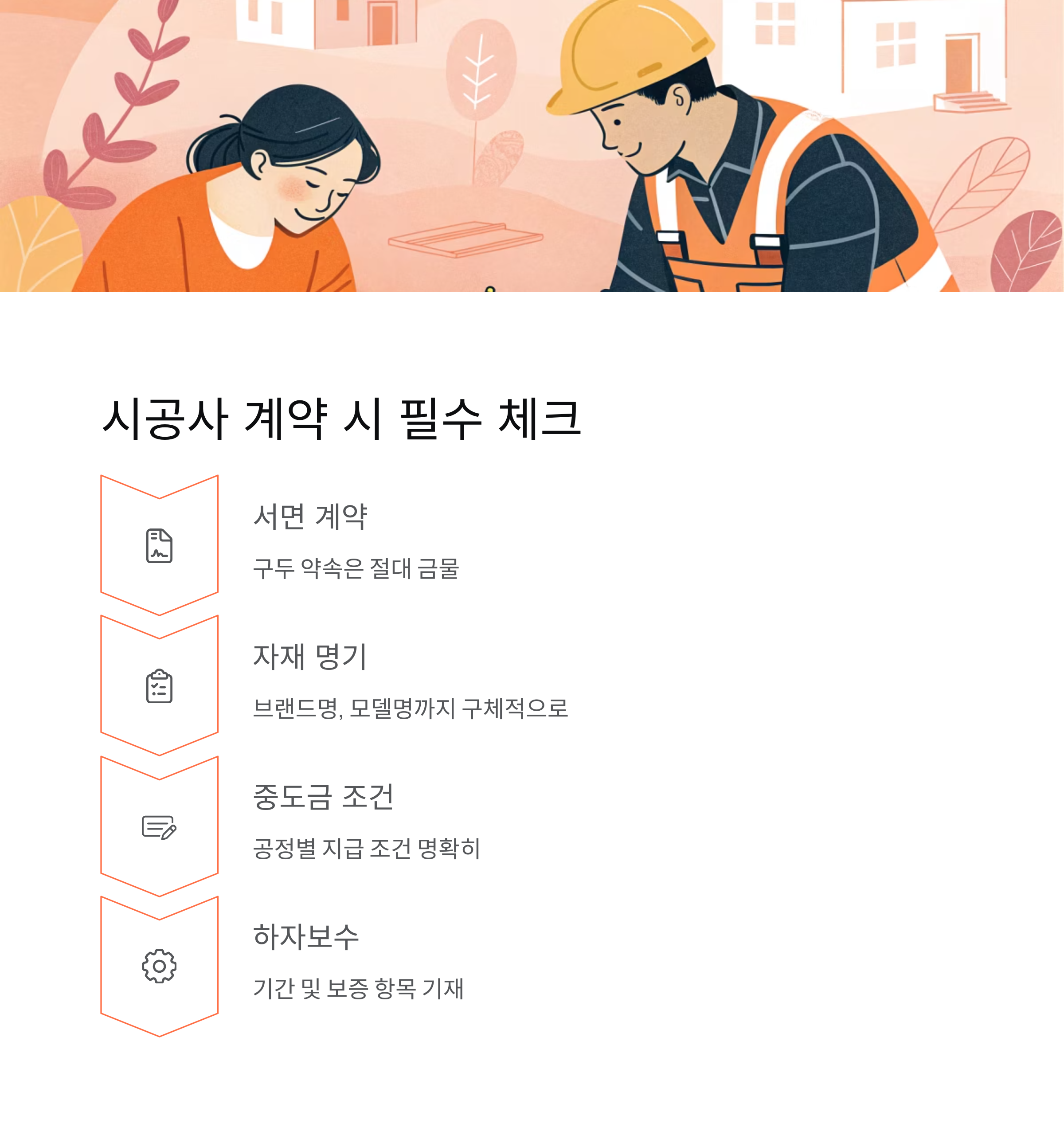 시공사와 계약을 할 때는 무조건 ‘서면 계약’을 해야 해요. 구두로만 약속하고 시작했다가, 공사 중간에 공정 누락이나 금액 변경 문제가 생기면 책임을 묻기 어려워요. 계약서에는 공사 범위, 자재 종류, 공사 기간, 하자보수 조건 등이 반드시 포함돼야 해요.
