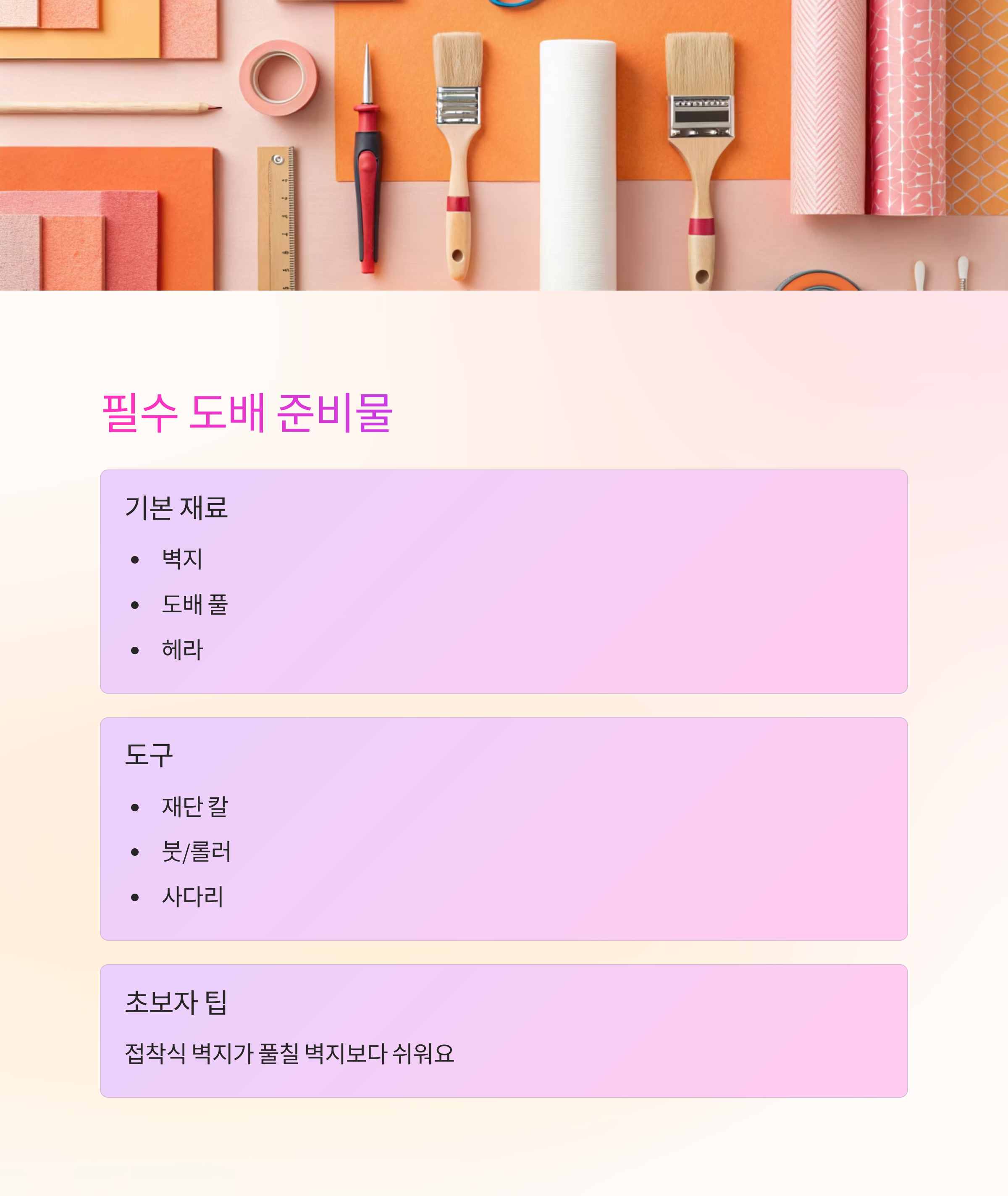 이런 준비물만 제대로 갖추고 시작하면, 셀프 도배의 50%는 성공한 거라고 할 수 있어요! 다음으로는 벽 상태 확인과 전처리에 대해 알아볼게요.