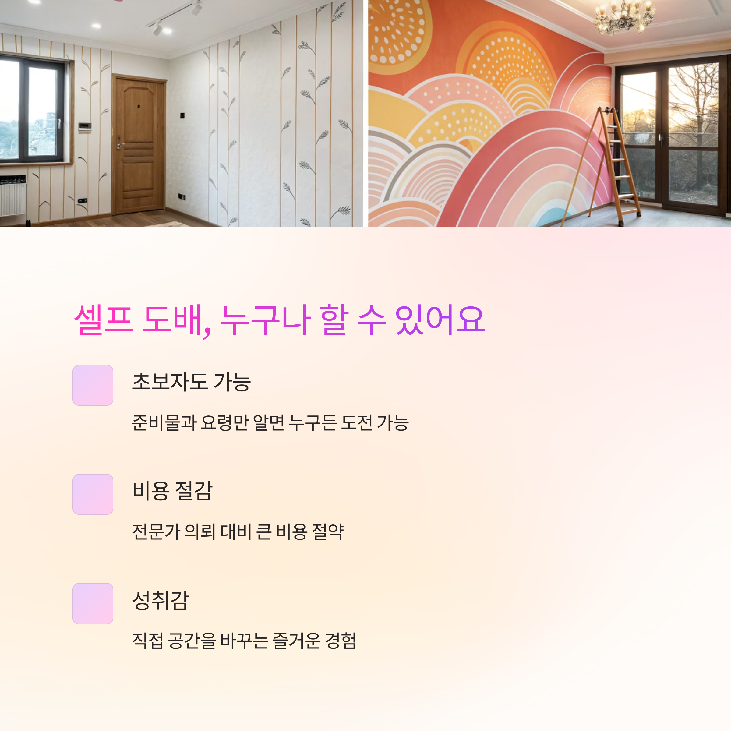 또한 셀프 도배는 단순히 벽지를 붙이는 작업이 아니라, 공간을 새롭게 꾸미는 즐거운 경험이기도 해요. 자신이 직접 선택한 벽지를 붙이고, 그 결과를 보는 만족감은 말로 표현하기 어려울 만큼 기분 좋답니다.