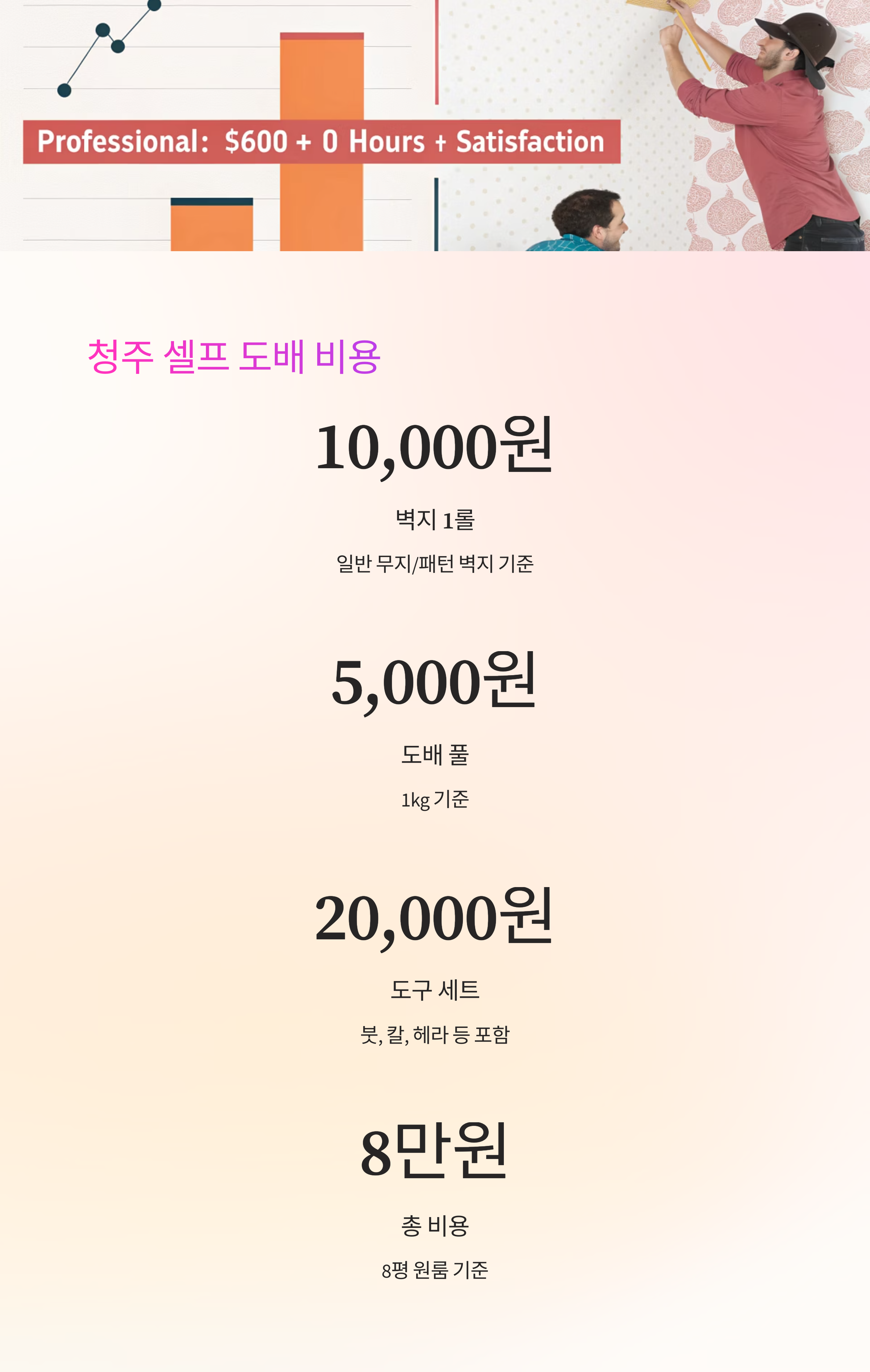 셀프 도배의 가장 큰 장점 중 하나는 ‘비용 절감’이에요. 전문가에게 맡기면 평당 2~3만 원 이상이 들어가지만, 직접 하면 벽지와 도구 구입비만으로 해결할 수 있어요. 특히 청주에서는 도배 부자재를 오프라인에서 저렴하게 구할 수 있어서 더 경제적이에요.