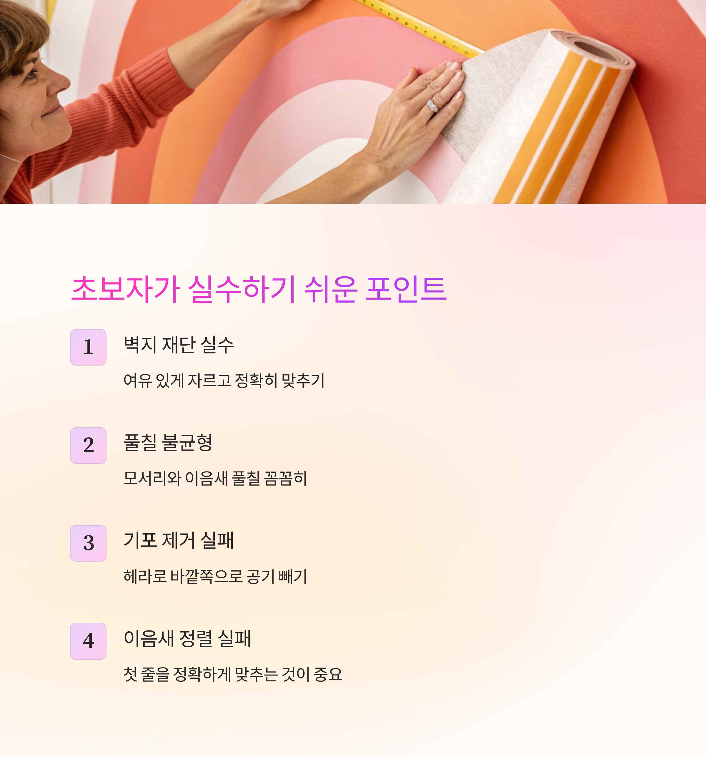| 기포 제거 실패 | 벽지 들뜸 | 헤라, 바늘 활용 |