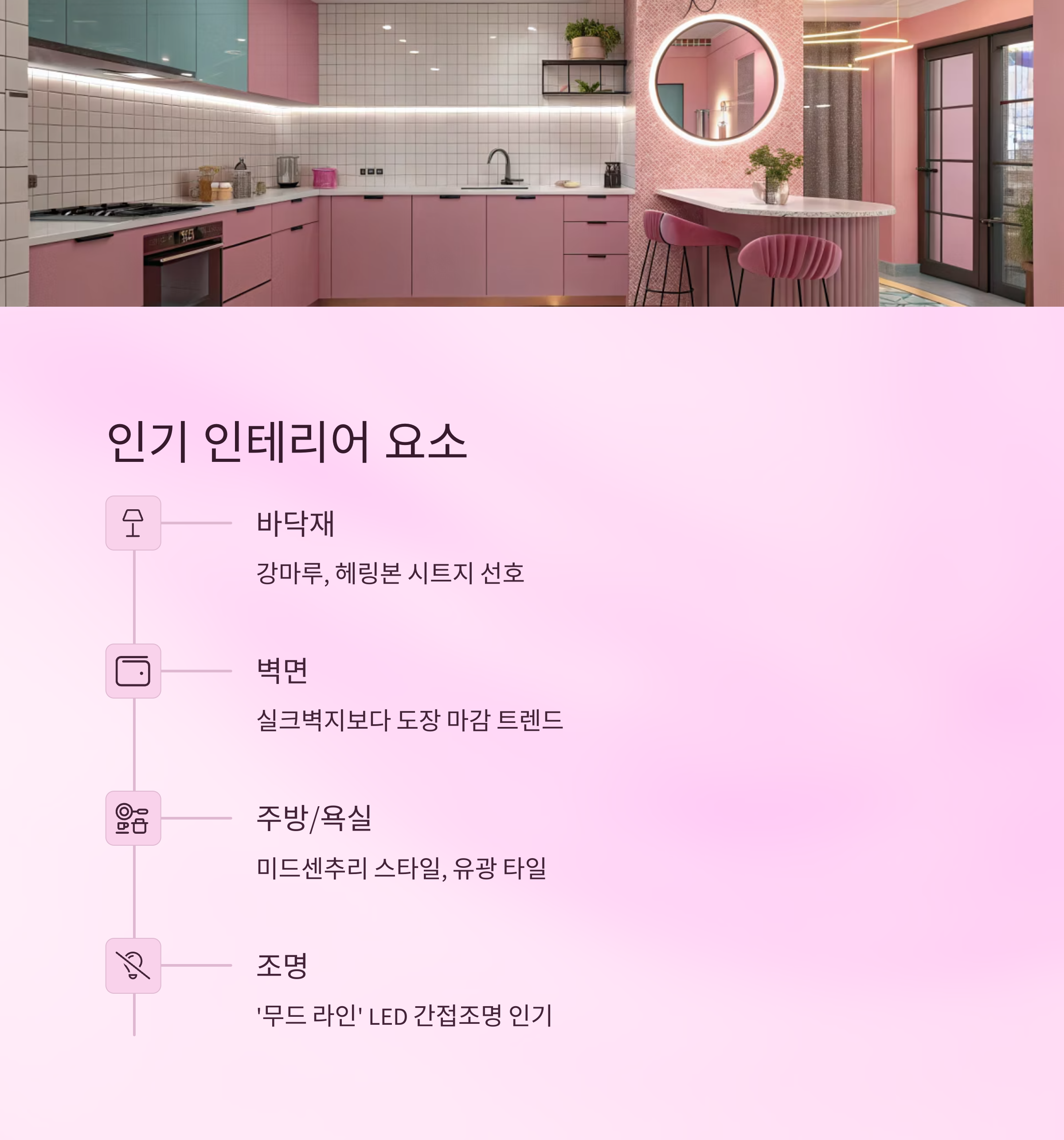 트렌드 측면에서는 ‘무드 라인’이라는 조명 설계 방식도 주목받고 있어요. 벽면 상단이나 하단에 LED 간접조명을 넣어 은은한 분위기를 연출하는 거죠. 작지만 고급스러운 느낌을 내기에 딱이에요.