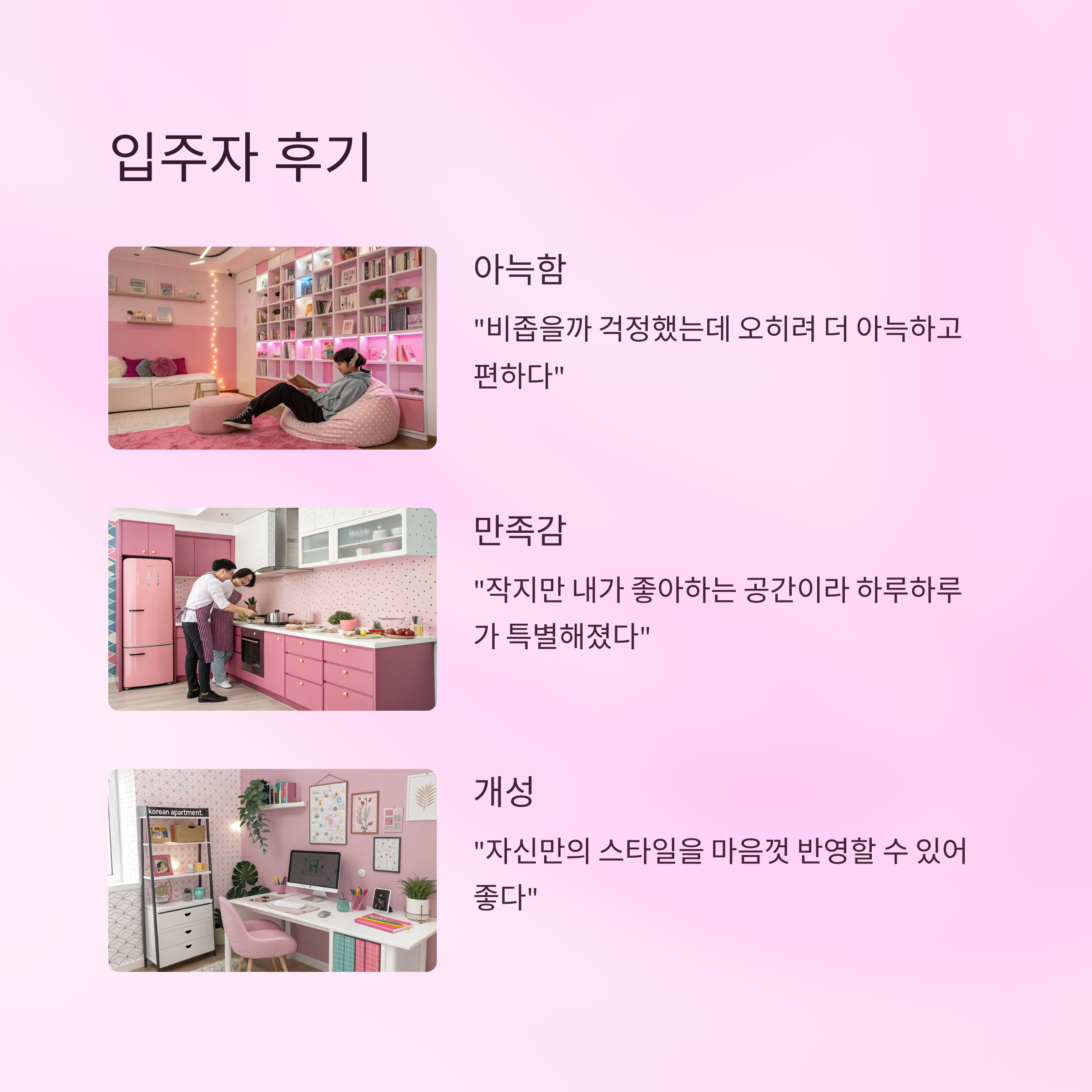 청주에서 소형주택에 입주한 분들의 후기를 보면, “비좁을까 걱정했는데 오히려 더 아늑하고 편하다”는 반응이 많아요. 잘 설계된 인테리어는 불편함을 줄이고, 오히려 감성적인 공간을 제공해 주거 만족도를 높여준답니다.