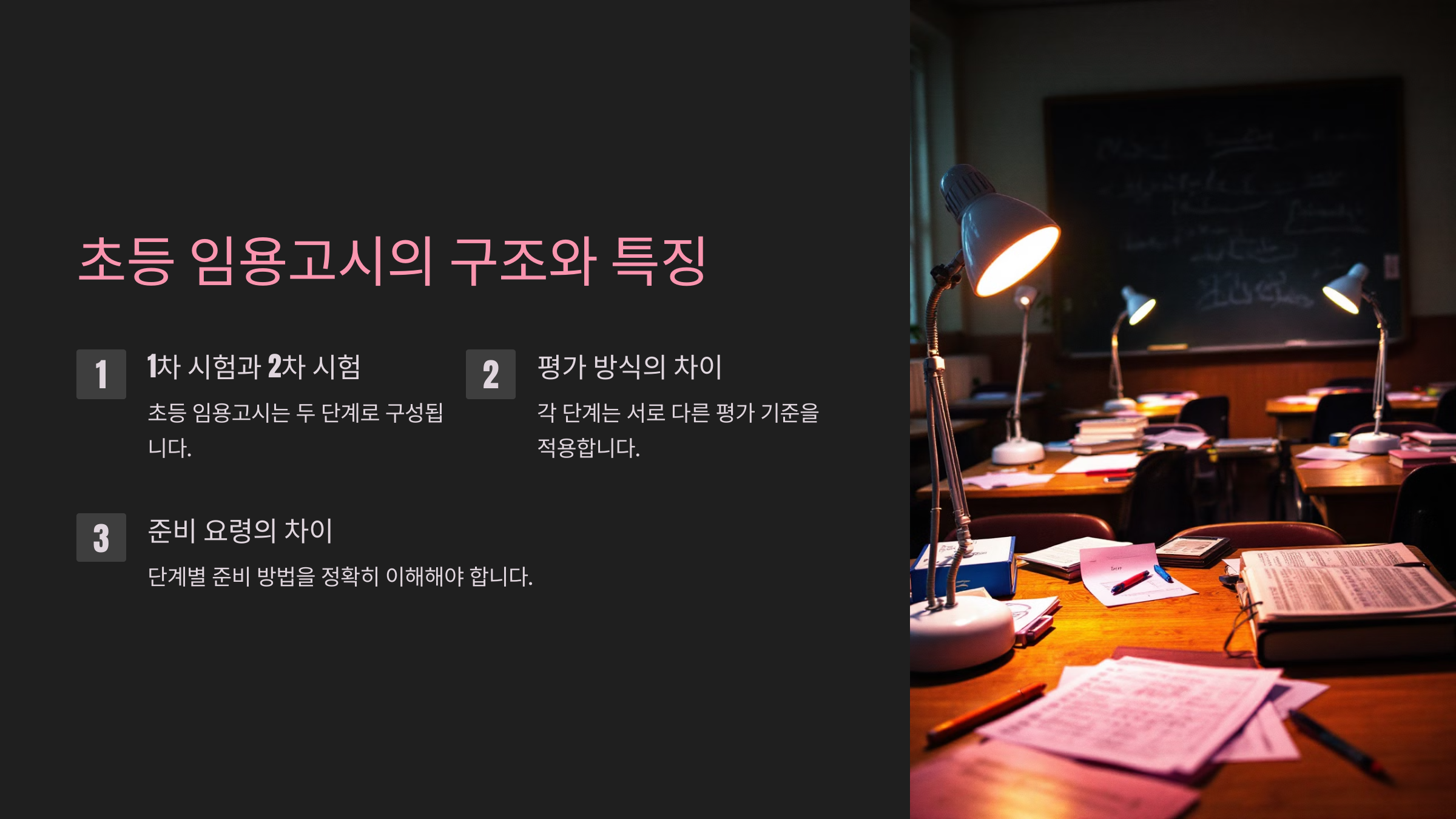 초등 임용고시는 크게 1차 시험과 2차 시험으로 나누어집니다. 각 단계는 서로 다른 평가 방식과 준비 요령을 요구하므로 정확히 이해하고 대비하는 것이 중요합니다.