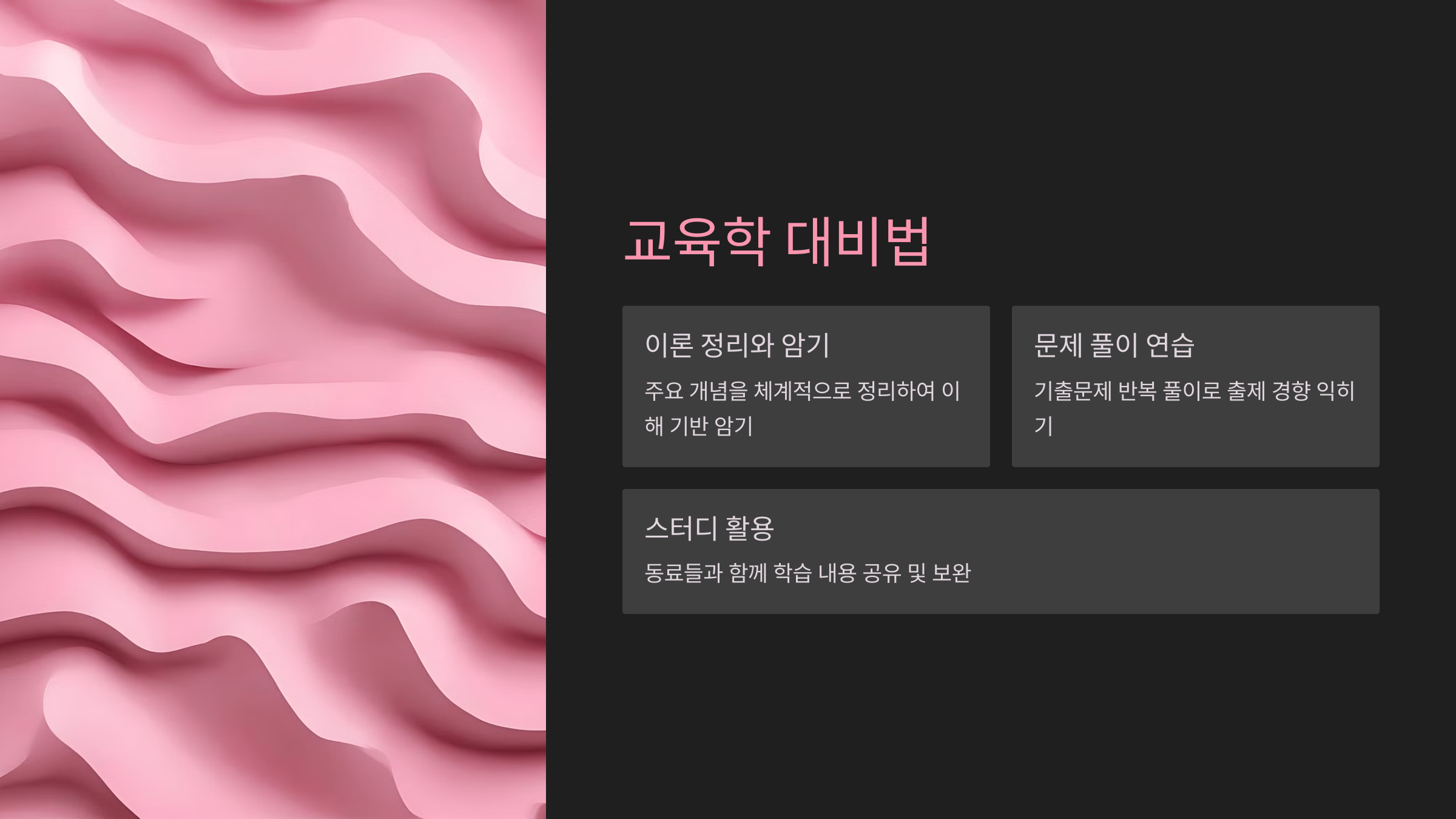 교육철학, 교육심리학 등 주요 개념을 정리하여 이해 기반 암기를 진행하세요. 예를 들어, 주요 학자의 이론을 표로 정리하거나 요약하여 빠르게 복습할 수 있도록 준비하세요.