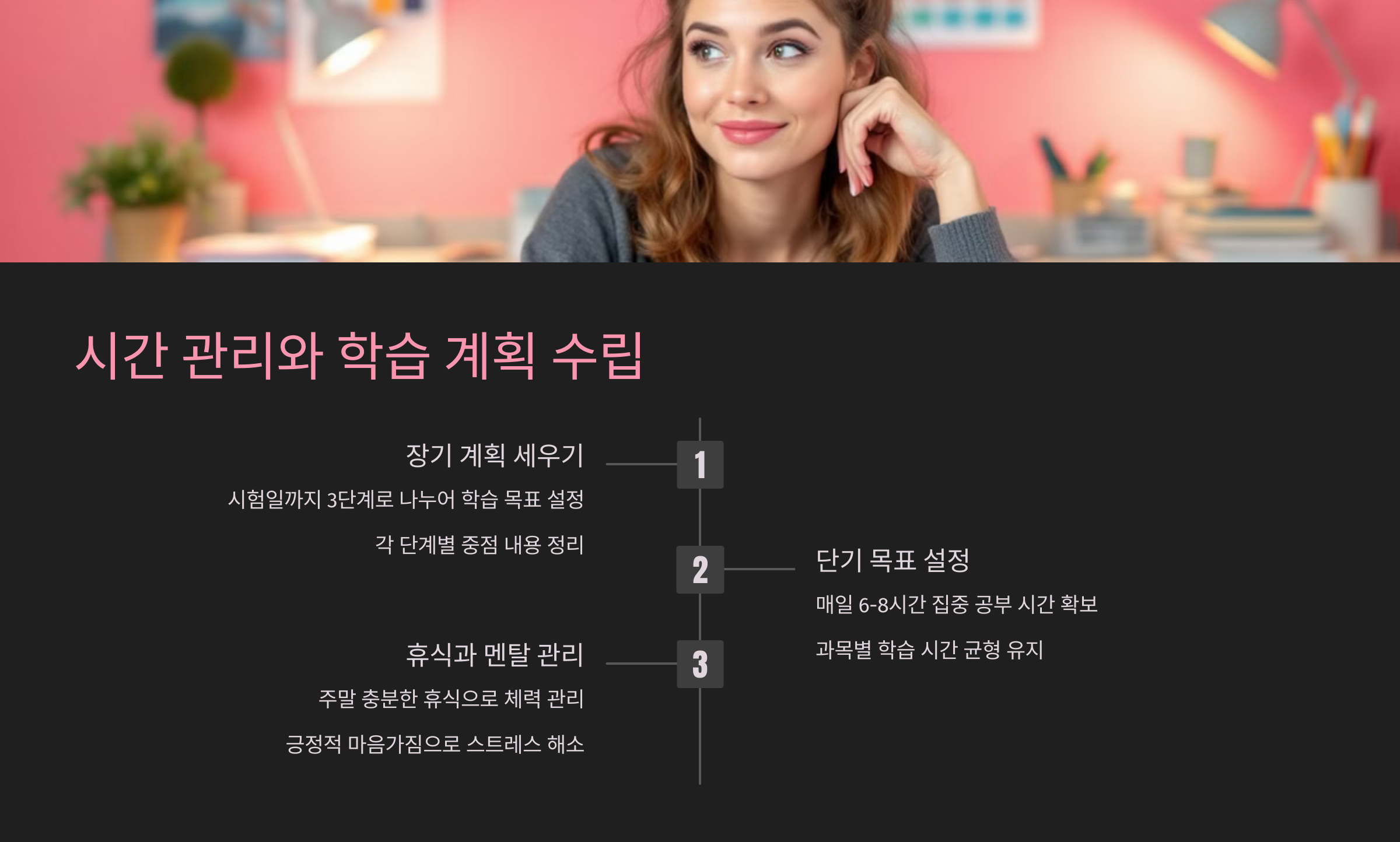 - 시험일까지의 기간을 3단계(기초, 심화, 최종 점검)로 나누어 학습 목표를 설정하세요. 각 단계마다 중점적으로 다룰 내용을 명확히 정리하세요.