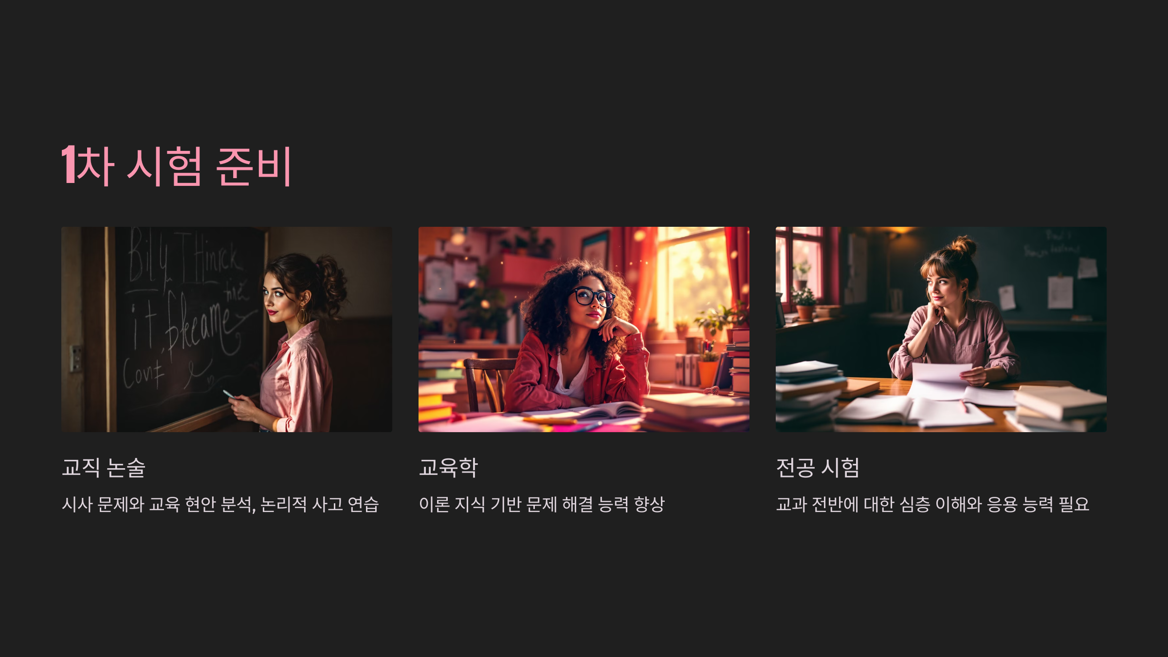 - 매일 6~8시간을 집중적으로 공부할 시간을 확보하세요. 예를 들어, 오전에는 논술, 오후에는 교육학, 저녁에는 전공 과목을 학습하며 시간을 배분하세요.