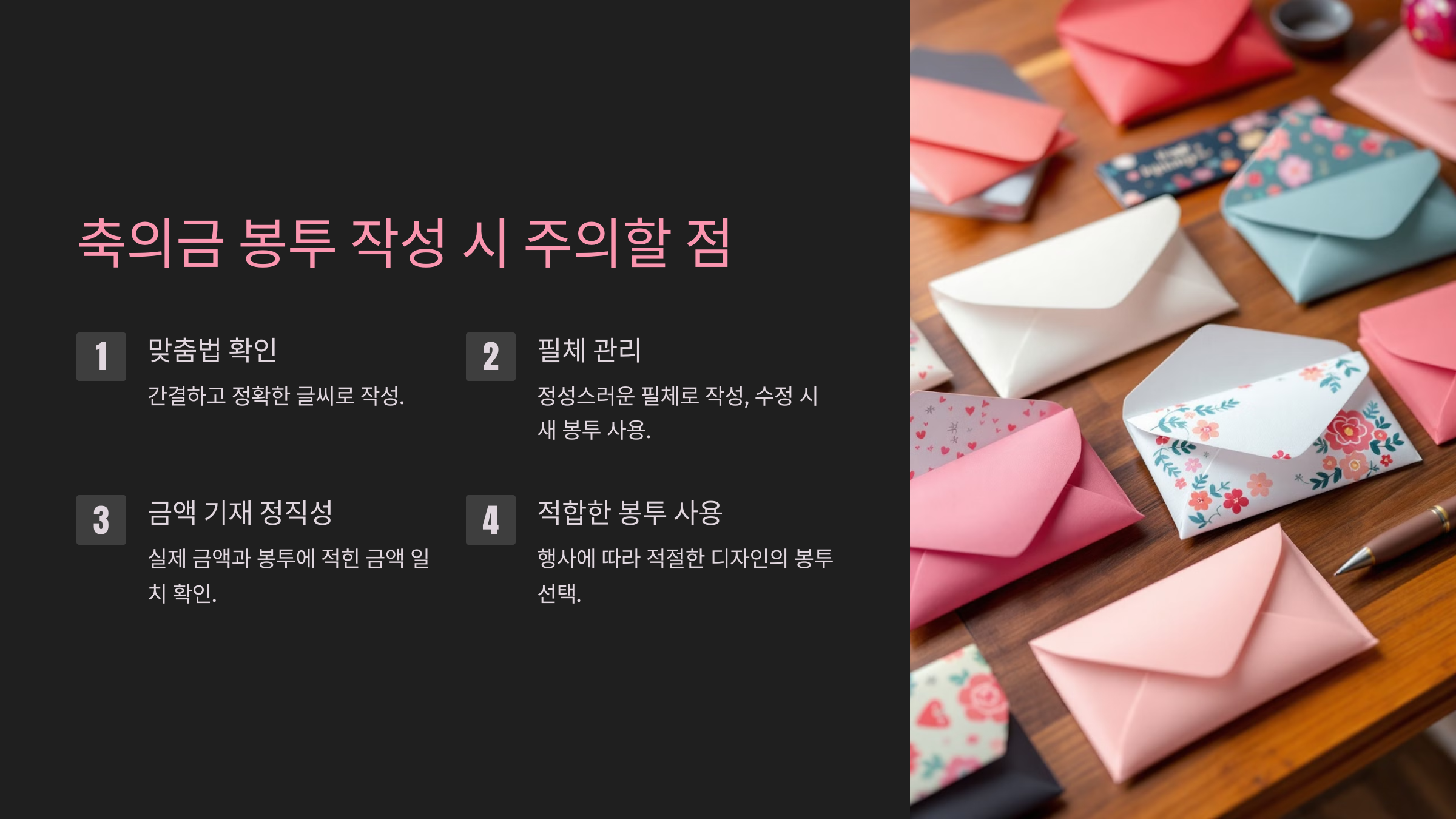 실제 금액과 봉투에 적힌 금액이 일치해야 하며, 정확히 확인합니다. - 적합한 봉투 사용