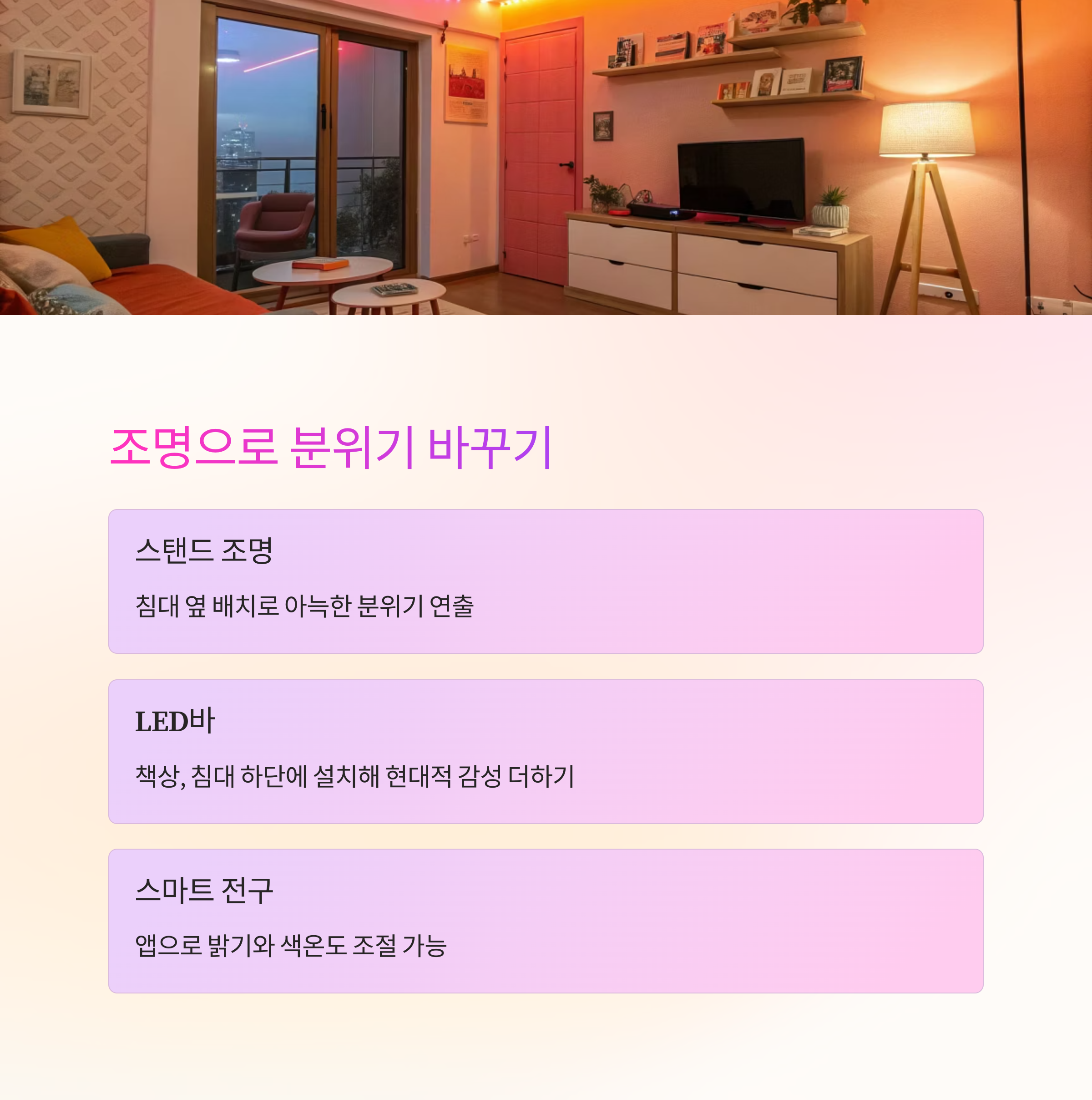 | 스마트 전구 | 앱으로 밝기 조절 | 천장, 스탠드 | 다양한 무드 연출 |