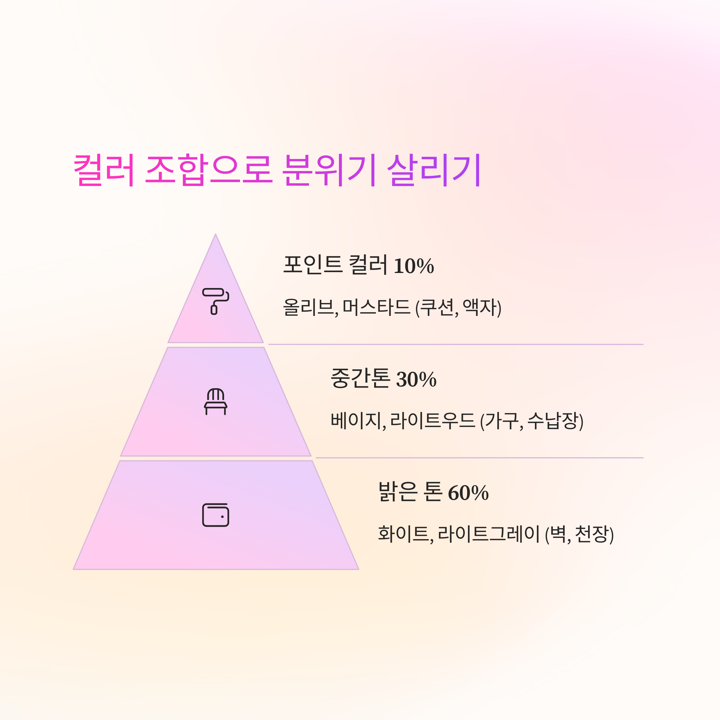 가장 효과적인 컬러 배치는 '3가지 톤 전략'이에요. 전체 공간의 60%는 밝은 톤, 30%는 중간톤, 10%는 포인트 컬러로 배치하면 감각적인 분위기가 자동 완성돼요. 가구와 소품 배색이 이 조화를 이루면 사진으로 찍었을 때도 감성 폭발이에요. 📸