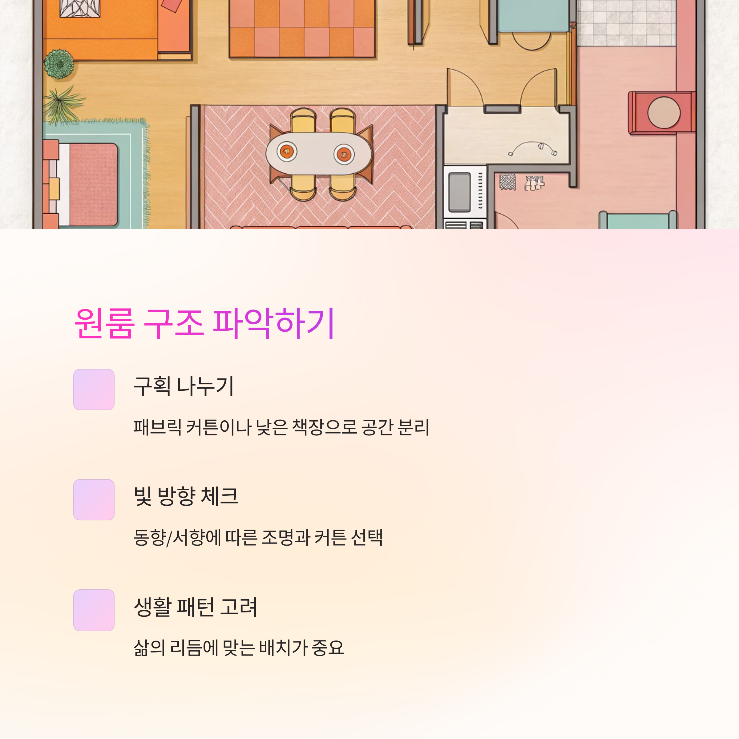 예를 들어, 침대 주변엔 패브릭 커튼을 달아 잠자는 공간만의 분위기를 조성할 수 있어요. 주방과 침대 사이에 낮은 책장을 배치하는 것도 방법이에요. 구조를 알면 가구 배치가 수월해지고, 답답함도 줄어들어요.