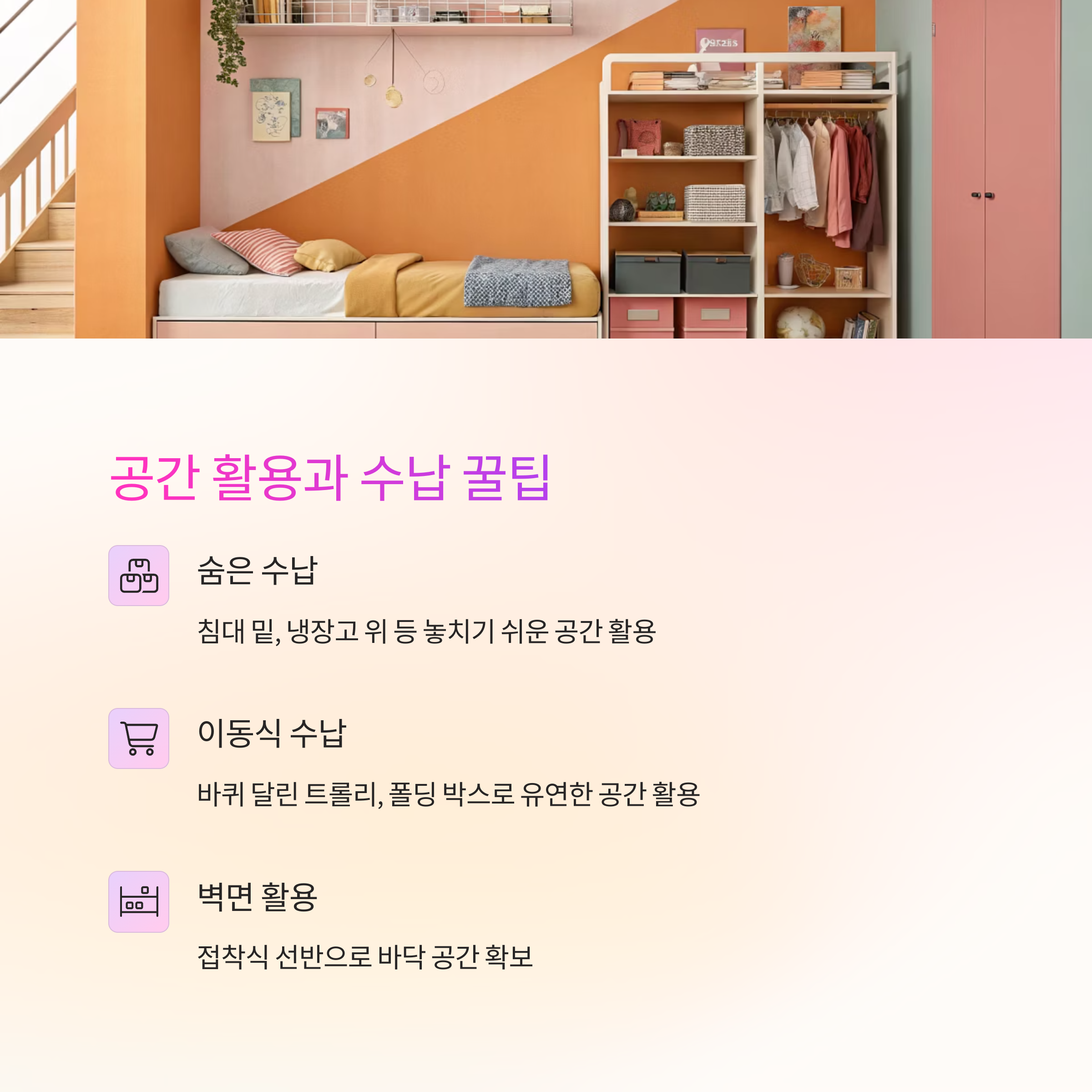 냉장고 위 선반 설치, 다용도 수납함 활용, 침대 옆 협탁 대신 수납박스 놓기 같은 현실적인 팁이 많아요. 공간에 따라 맞춤형 인테리어가 필요하다는 걸 체감하게 된다고 해요.