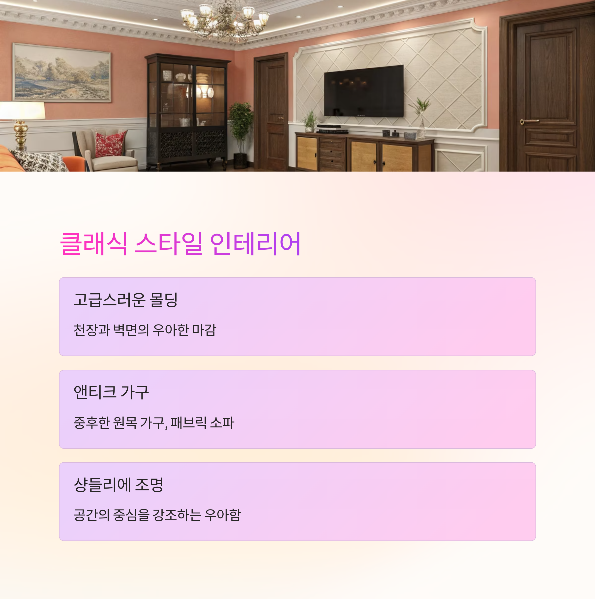 컬러는 베이지, 샴페인, 다크 브라운 계열이 주로 쓰여요. 여기에 금장 디테일이 들어가면 우아함이 극대화되죠. 가구는 앤티크 느낌의 원목 가구나 패브릭 소파가 잘 어울리며, 천장이 높아 보이게 몰딩으로 포인트를 줘요.