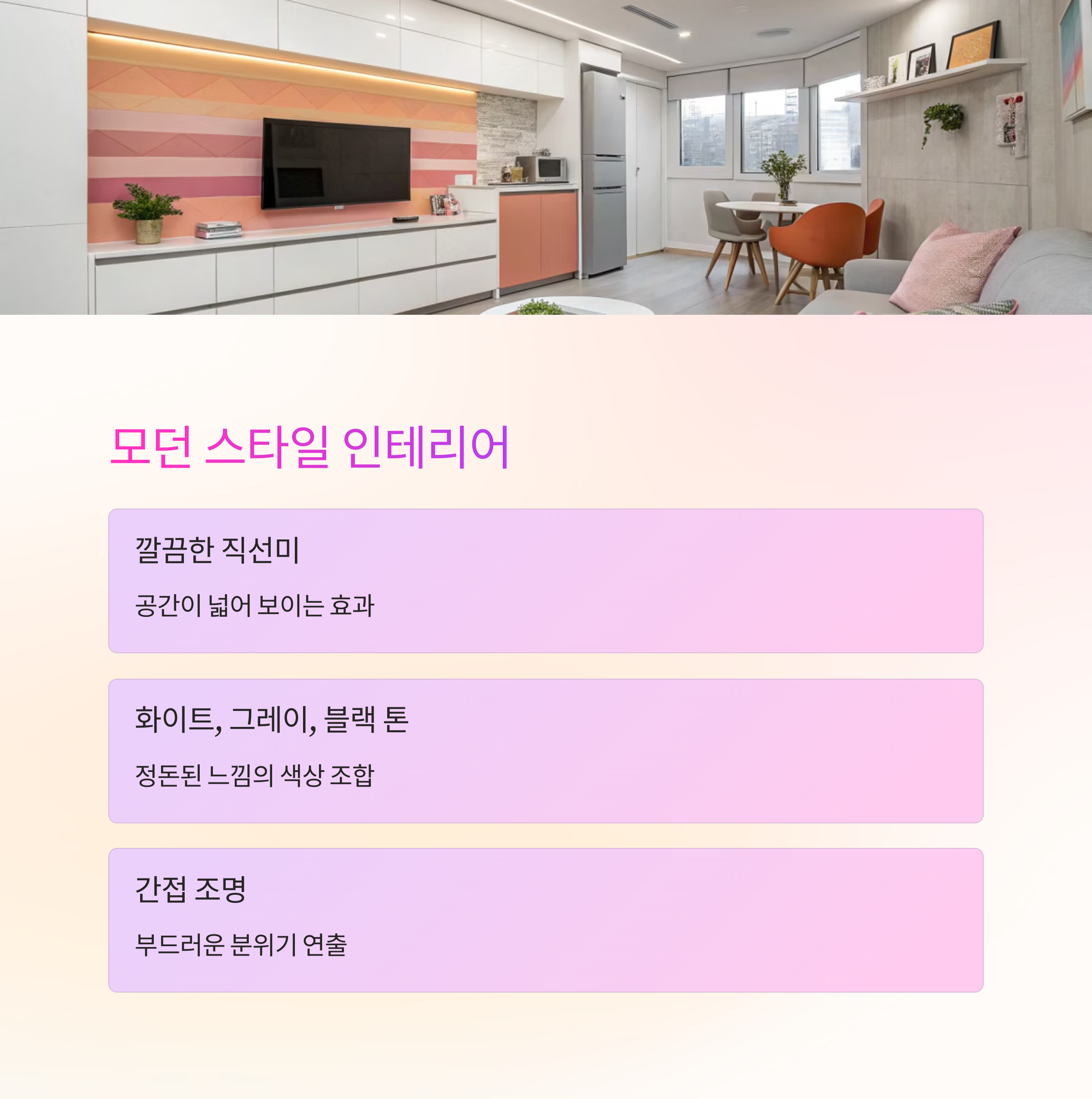 화이트, 그레이, 블랙 톤을 주로 사용하며, 수납 공간은 최소한의 노출만 허용해요. 벽걸이형 TV, 매립 조명, 붙박이장 등 공간 활용을 최대화하면서도 디자인은 일관되게 맞춰주는 게 포인트랍니다.