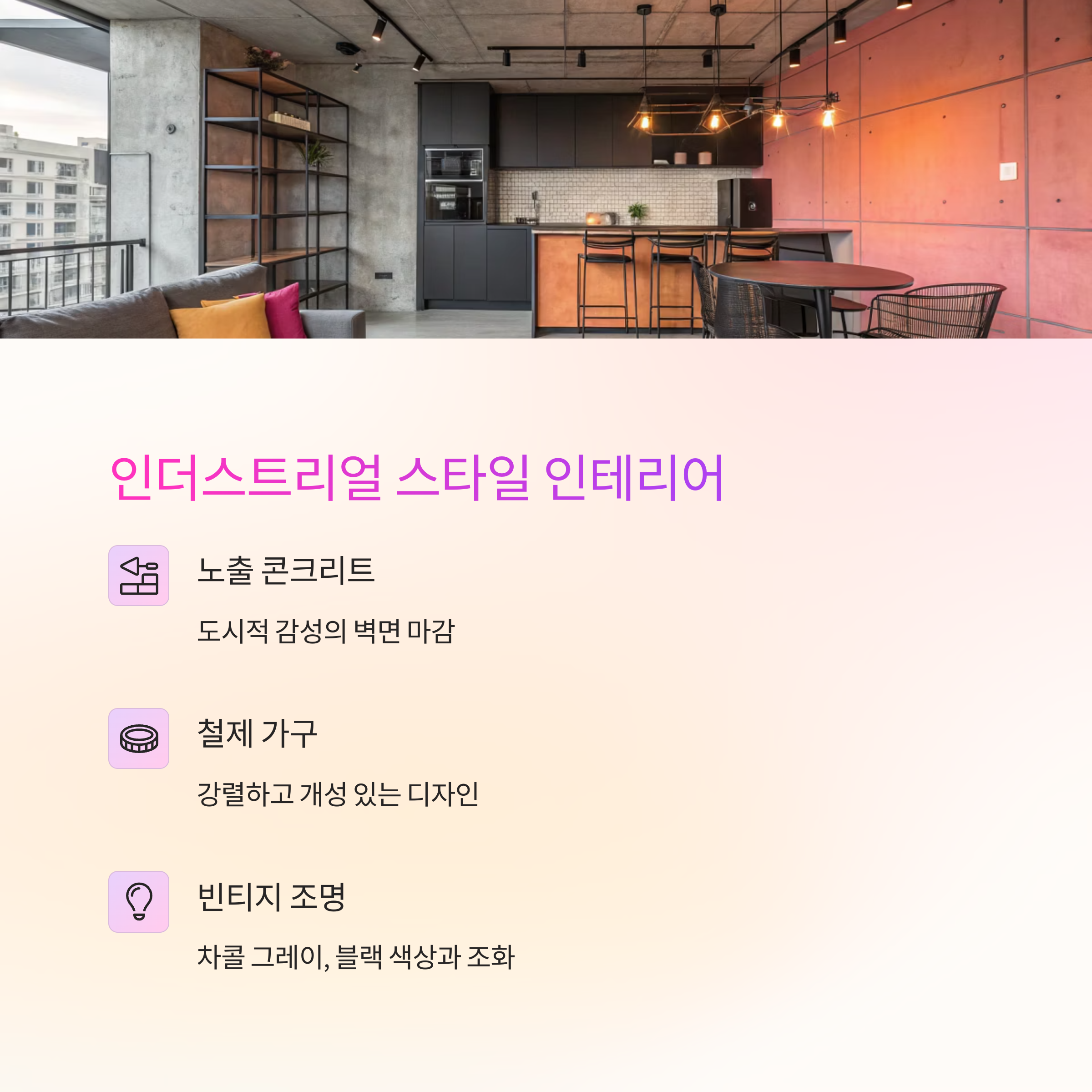 색상은 차콜 그레이, 블랙, 딥 브라운이 주로 사용되고, 빈티지한 느낌의 가죽 소파나 철제 선반과도 잘 어울려요. 벽면을 벽돌 느낌으로 마감하거나, 천장을 오픈형 구조로 노출시키는 것도 멋을 더하는 포인트예요.