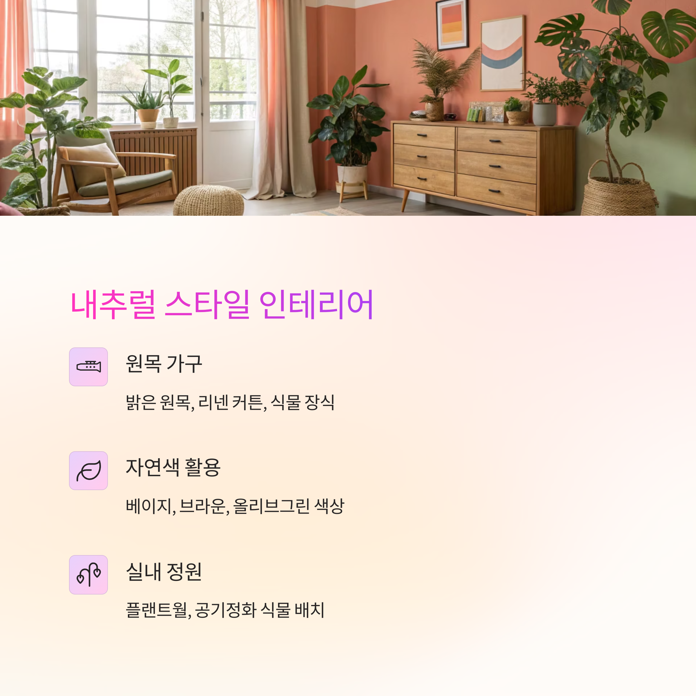 생활 속에서 자연을 느끼고 싶은 분들에게 내추럴 스타일은 정말 좋은 선택이에요. 공기정화 식물이나 조용한 분위기의 톤은 매일의 피로를 덜어줄 수 있답니다. 특히 충주처럼 사계절이 뚜렷한 도시엔 딱 맞아요.