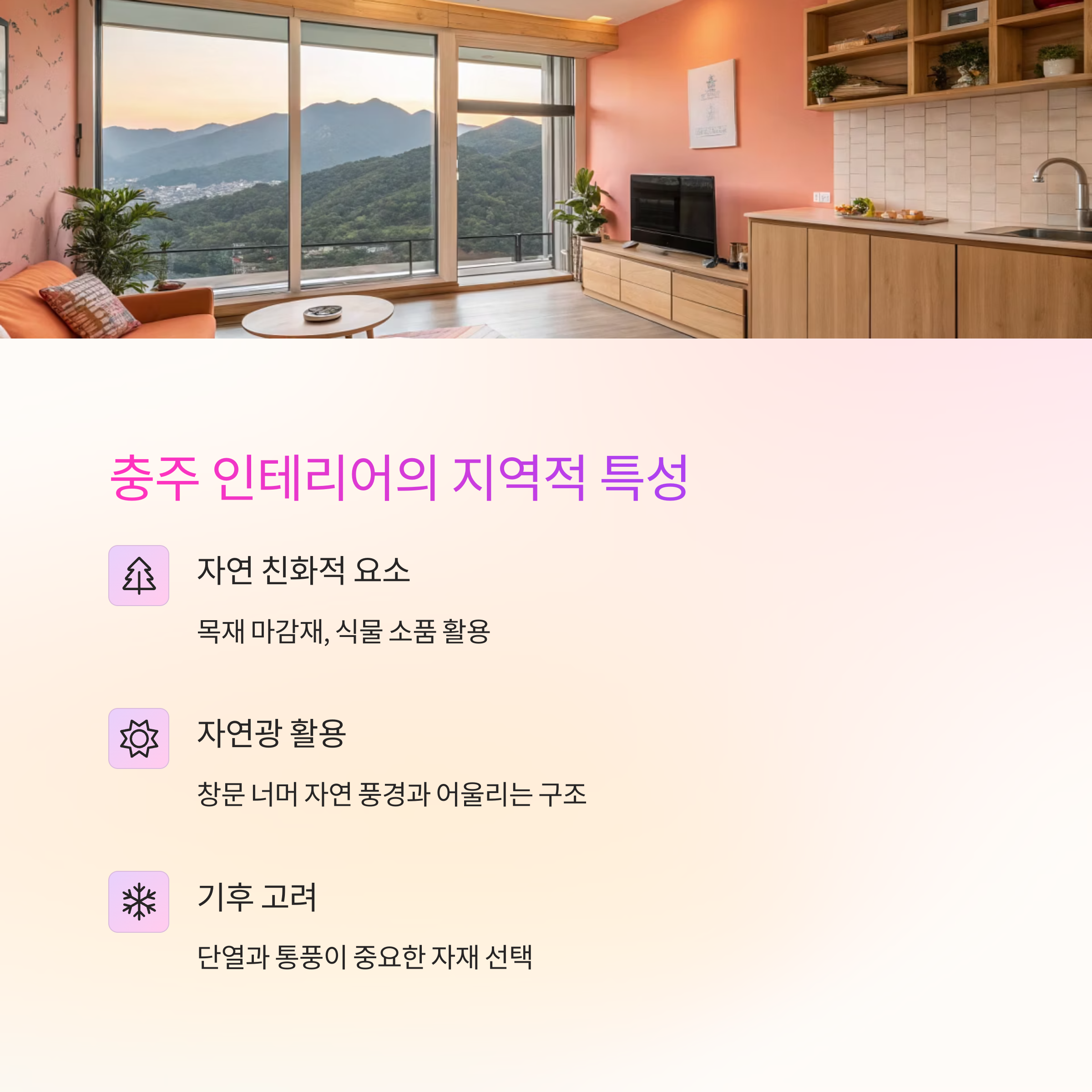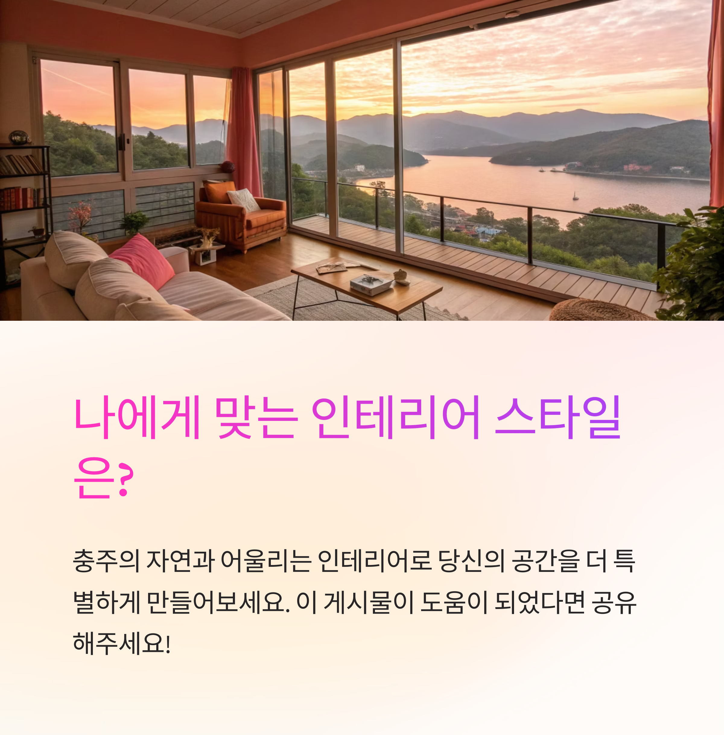 충주는 도시지만 너무 복잡하지 않아서, 따뜻하고 여유로운 분위기의 인테리어가 참 잘 어울리는 지역이에요. 실제로 많은 사람들이 도심의 트렌디함보다도 편안하고 오래 봐도 질리지 않는 인테리어를 선호하더라고요.