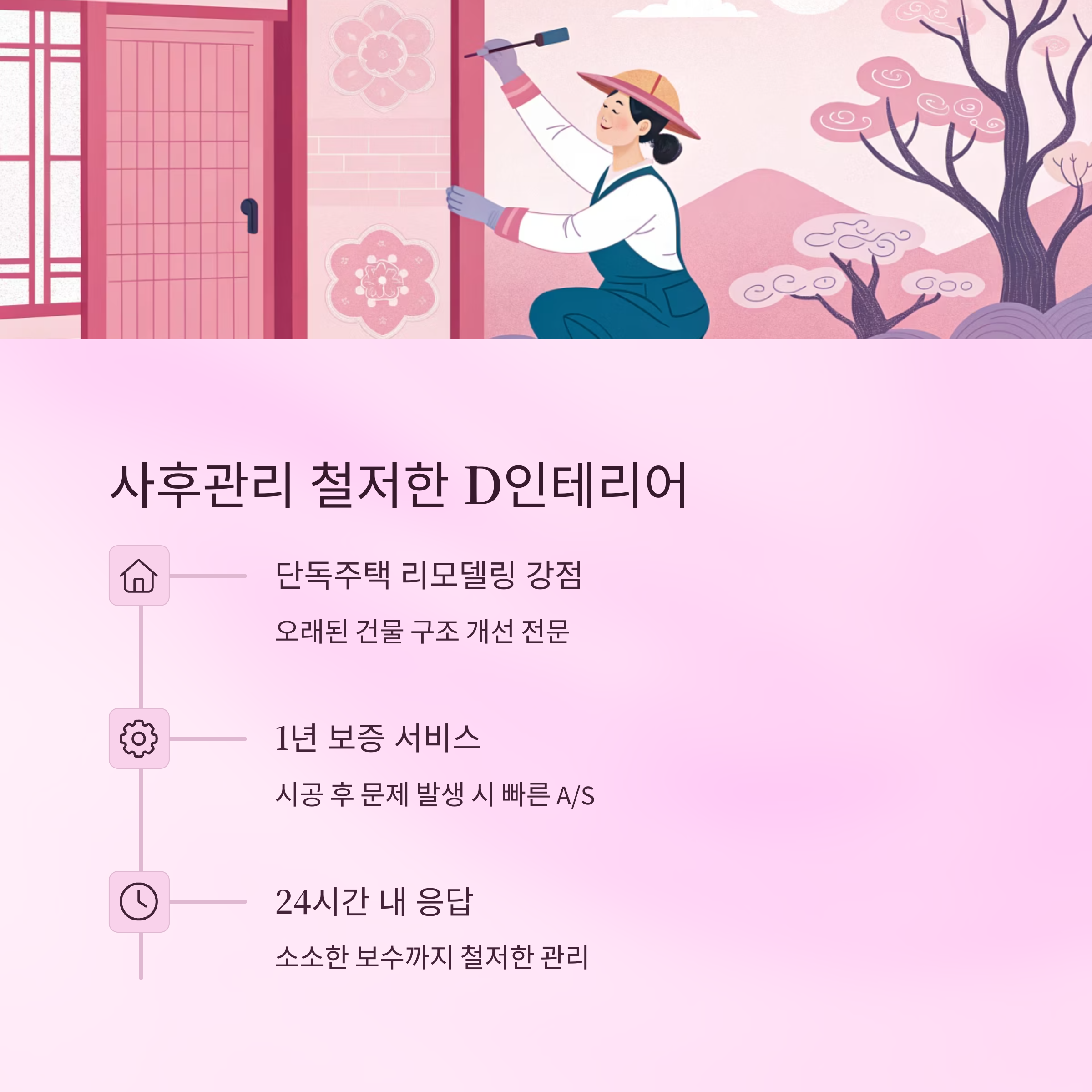 사후관리 서비스를 꼼꼼히 챙겨주는 D업체는 공사 후 문제 발생 시 빠르게 A/S를 해준다는 점에서 큰 신뢰를 얻고 있어요. 시공 후 1년 보증 서비스도 제공해 고객 만족도가 높아요.
