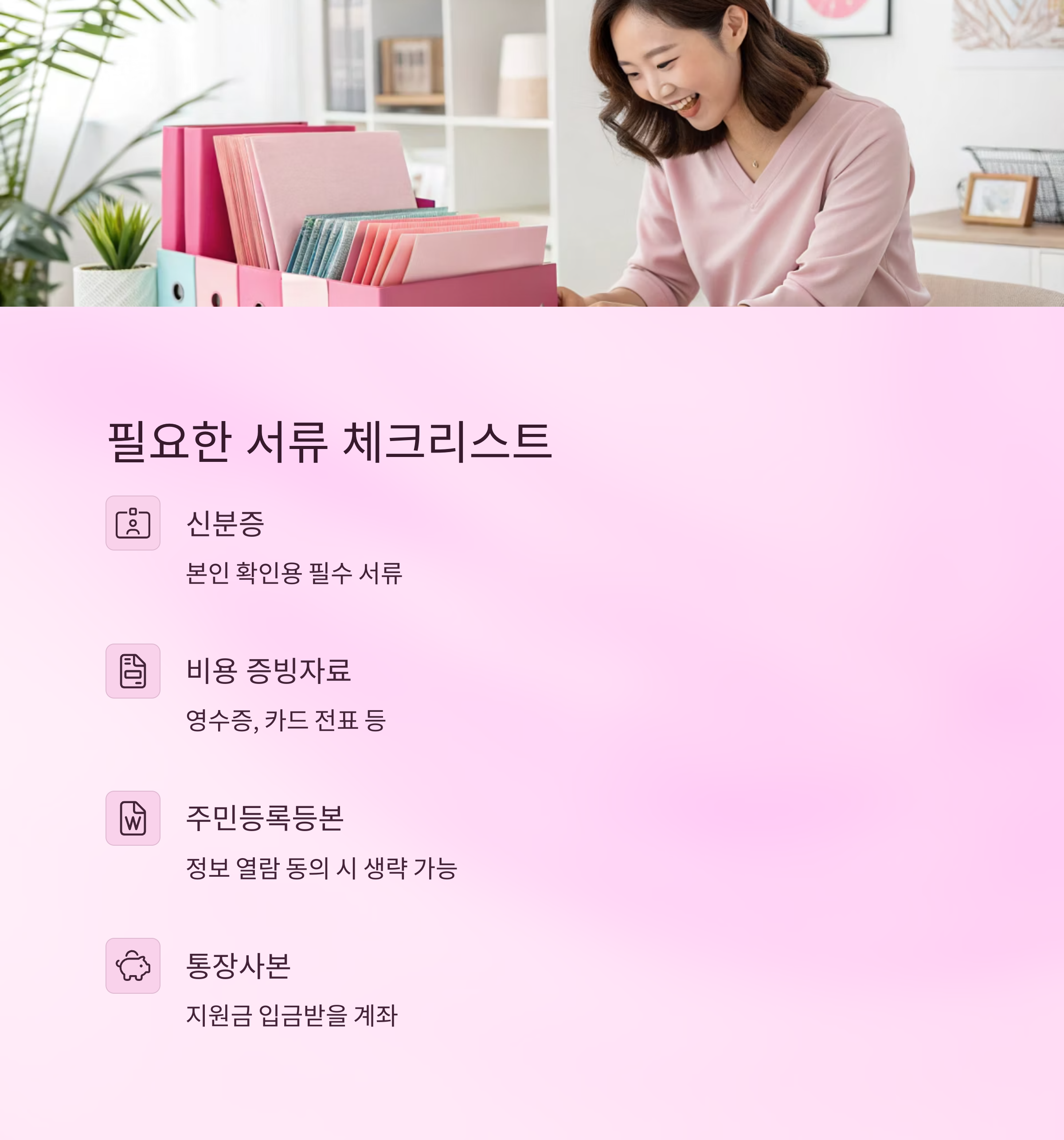 신청할 때는 몇 가지 서류가 필요해요. 기본적으로는 신분증, 조리비 지출 증빙자료(영수증, 전표 등), 주민등록등본, 그리고 통장사본이 필요해요.
