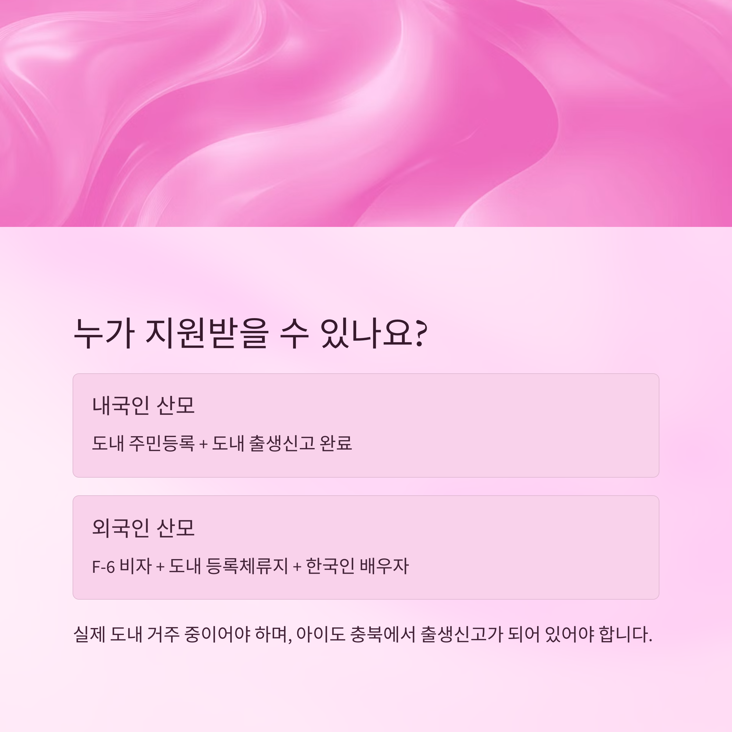 외국인 산모도 예외는 아니에요. 신청일 기준으로 등록외국인(F-6 비자)이면서 배우자가 대한민국 국적이라면 동일하게 신청이 가능하답니다. 충북도는 외국인 가족도 함께 돌보는 포용적인 정책 방향을 보여주고 있어요.