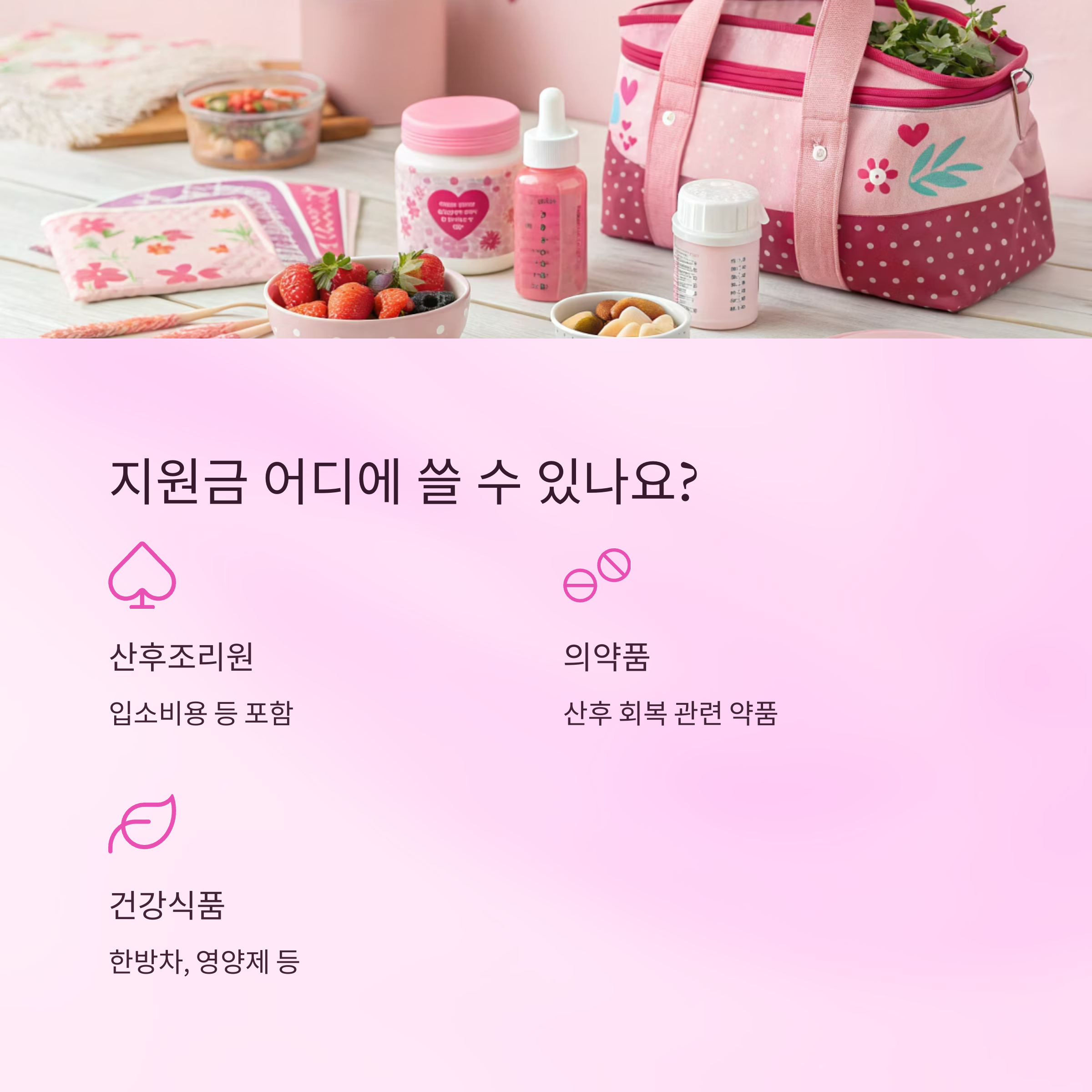 사용 가능한 항목은 단순 조리원 비용뿐만 아니라, 건강식품, 의약품, 산모 건강관리 등에 폭넓게 적용돼요. 다양한 분야에 쓸 수 있는 만큼, 본인의 건강 회복에 맞는 방식으로 활용할 수 있어요.