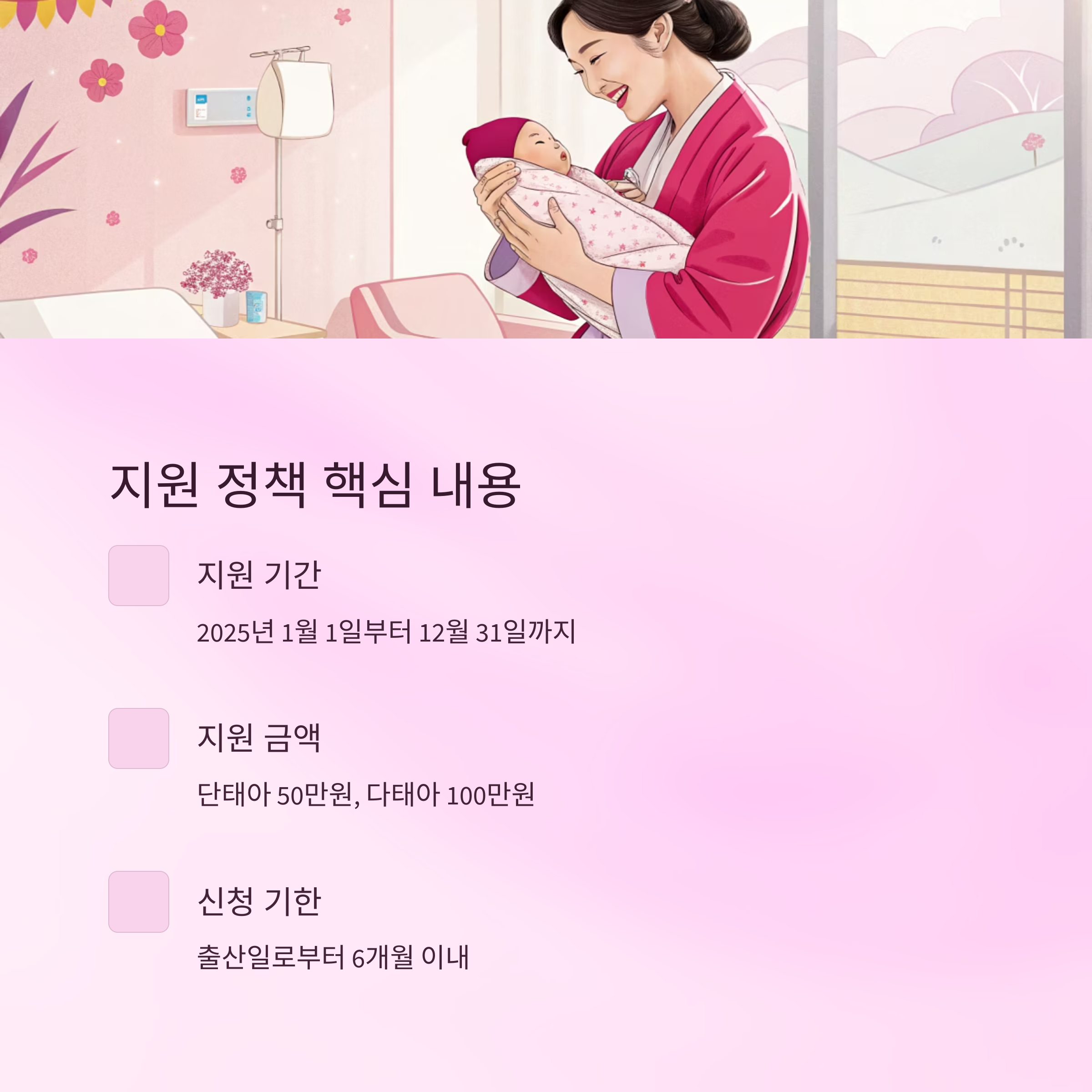 | 지원 금액 | 단태아 50만원 / 다태아 100만원 |