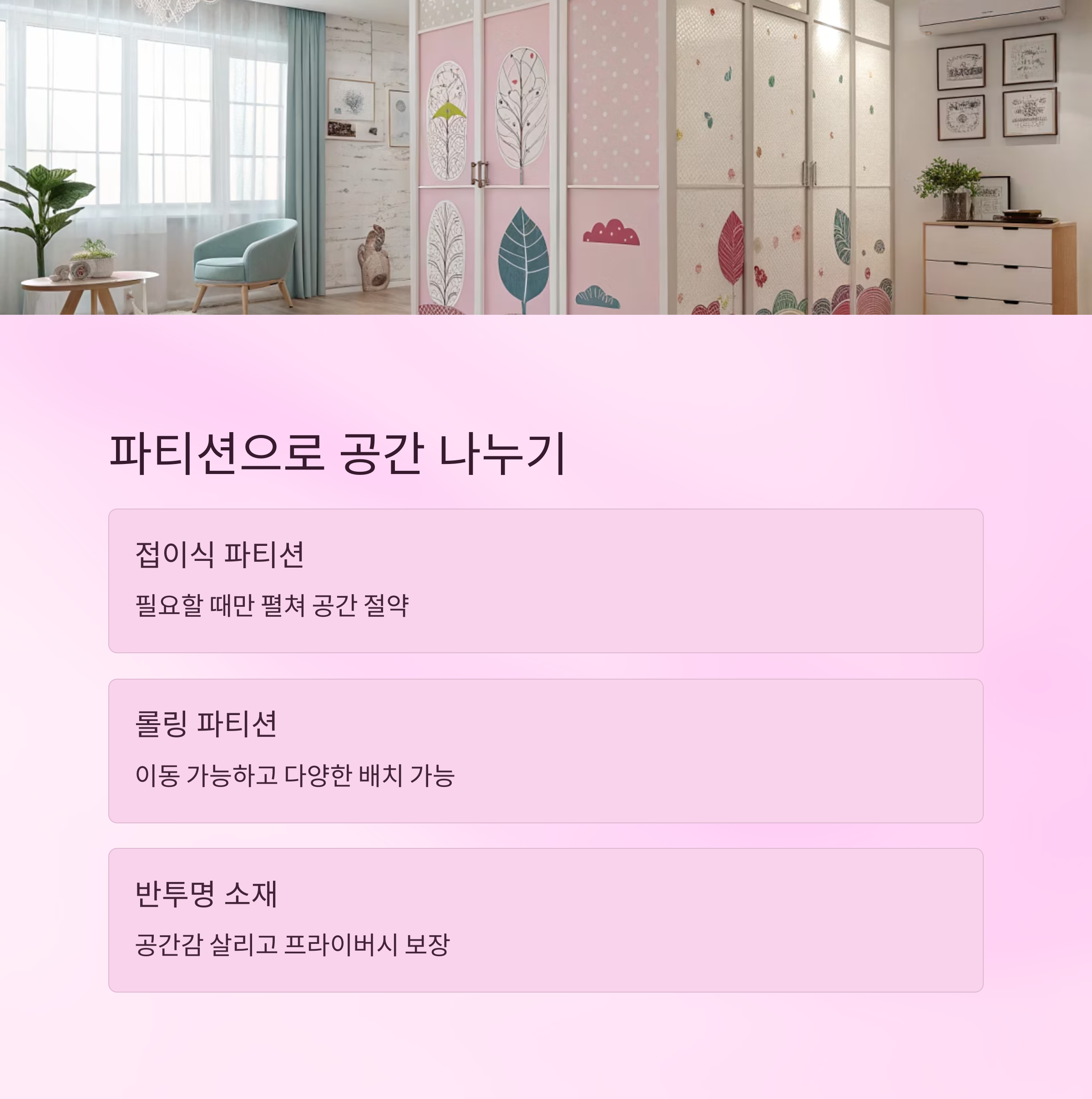 | 파티션 | 물리적 차단 확실 | 답답할 수 있음 | 거실/침실 분리 |