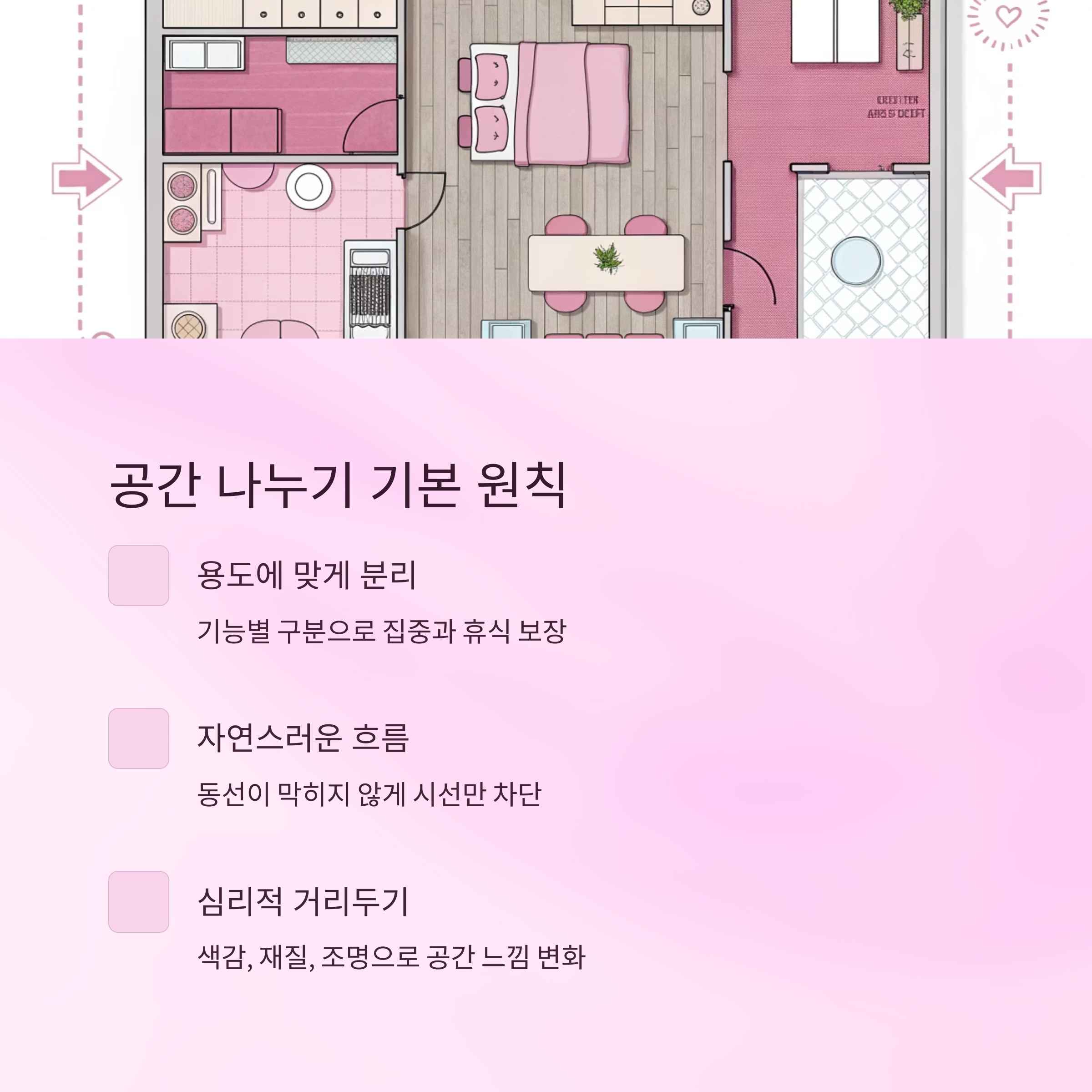 첫 번째 원칙은 '용도에 맞게 분리하라'예요. 예를 들어, 침실과 작업 공간은 기능이 다르기 때문에 명확하게 분리해야 집중과 휴식을 동시에 보장할 수 있어요. 이때는 물리적인 구획이 꼭 필요하지 않더라도 시각적으로 구분되면 충분히 효과를 줄 수 있어요.