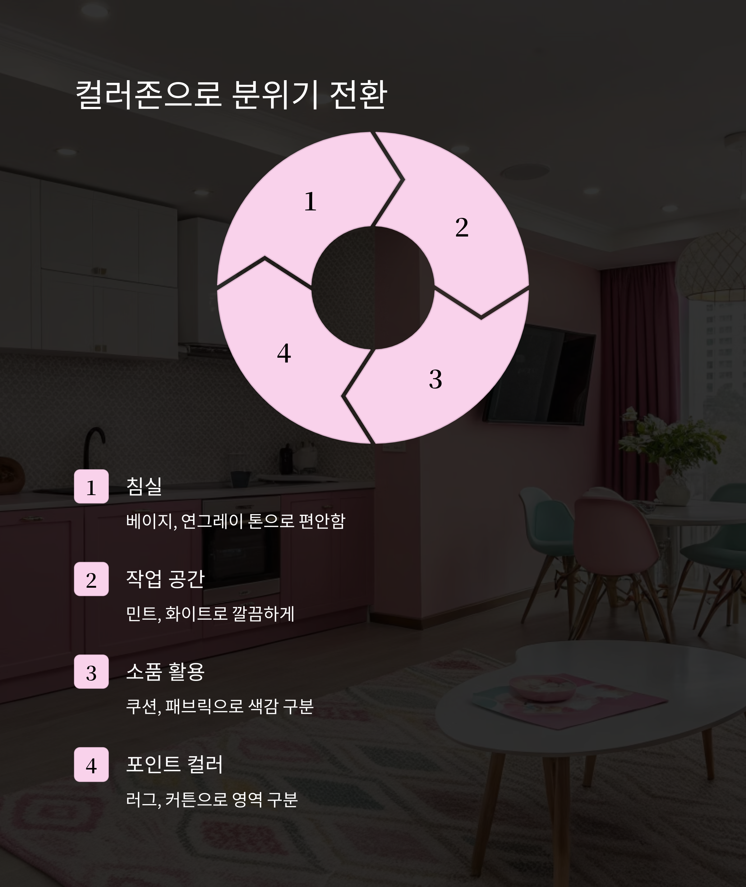 색상은 공간을 나누는 또 하나의 강력한 무기예요. 시각적으로 구획을 나누고, 각각의 공간에 다른 정체성을 부여해줄 수 있어요. 저는 이게 정말 효과적이라고 느꼈어요!