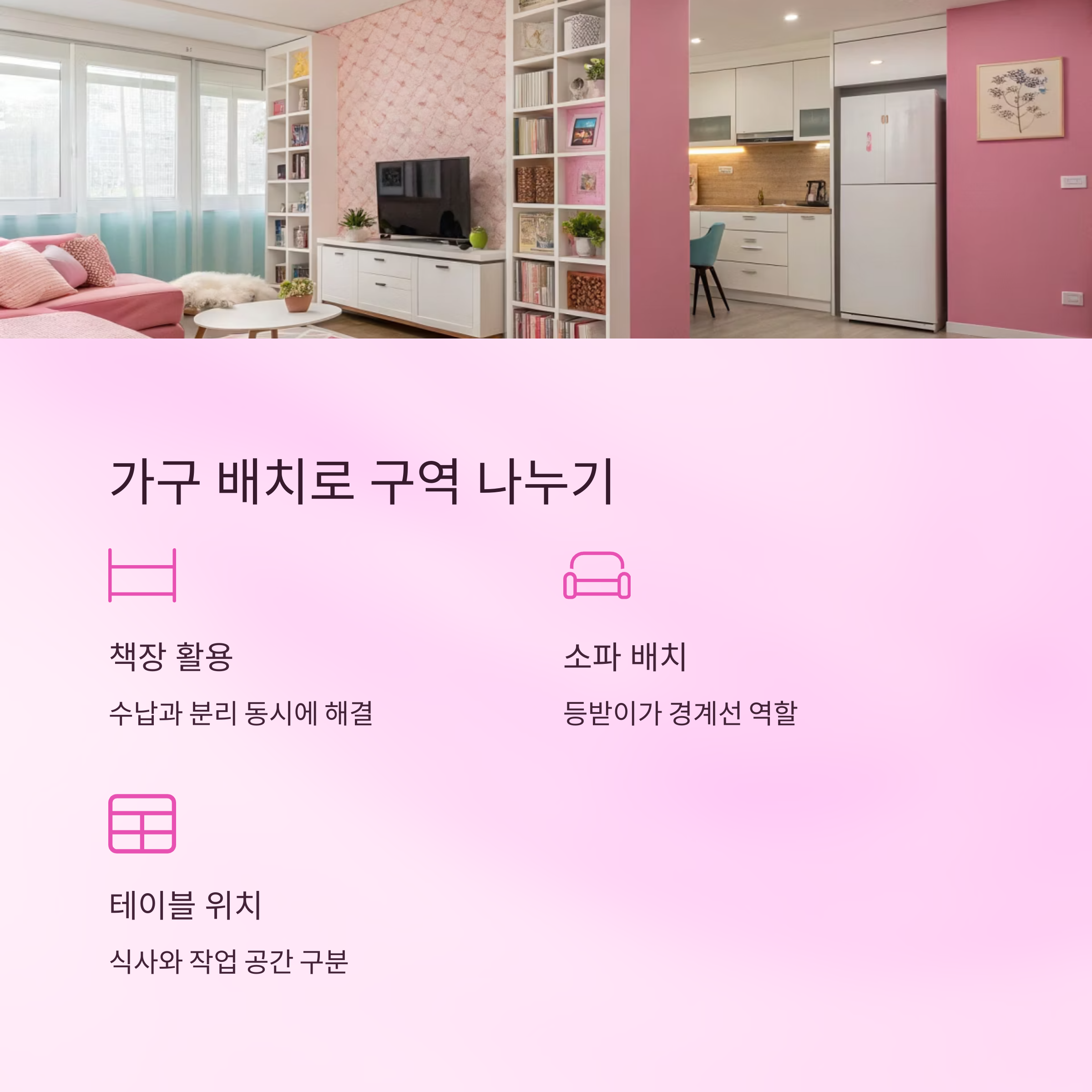 가구를 잘 활용하면 공간을 인위적으로 막지 않아도 자연스럽게 영역이 나뉘게 돼요. 특히 책장, 소파, 테이블 같은 대형 가구는 시선을 차단해주는 효과가 있어요.
