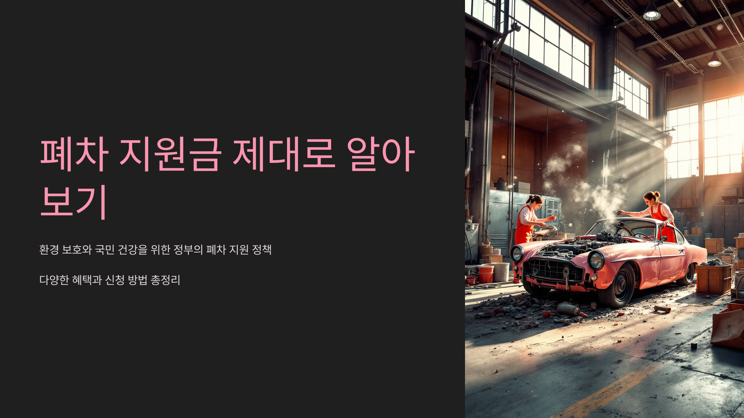 이번 글에서는 폐차 지원금의 개념부터 조기 폐차 보조금, 노후 경유차 조기 폐차 지원금, 디젤차 폐차 지원금까지 상세히 다루어 운전자들이 필요한 정보를 이해하기 쉽게 정리하였습니다. 폐차 지원금과 관련된 모든 혜택과 신청 방법을 꼼꼼히 살펴보고, 이를 통해 지원금을 놓치지 않고 받을 수 있는 방법을 안내드립니다.