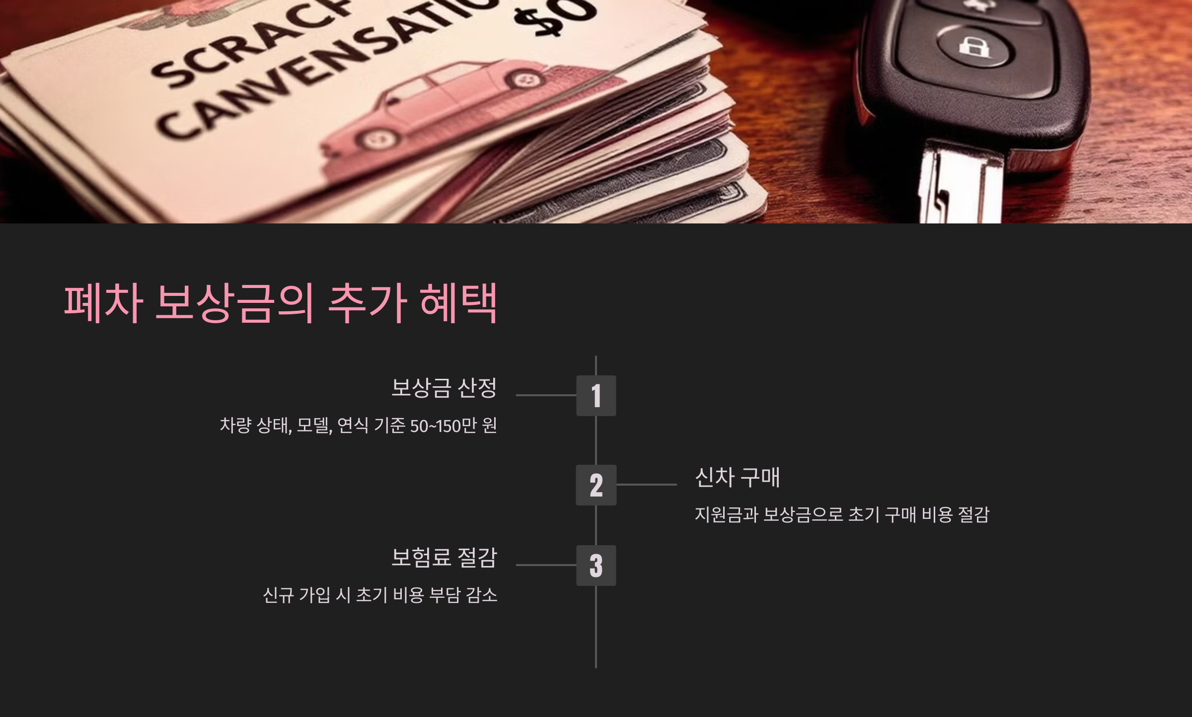 - 신차 구매 자금으로 활용할 수 있습니다. 지원금과 보상금을 합치면 초기 구매 비용을 크게 절감할 수 있습니다.