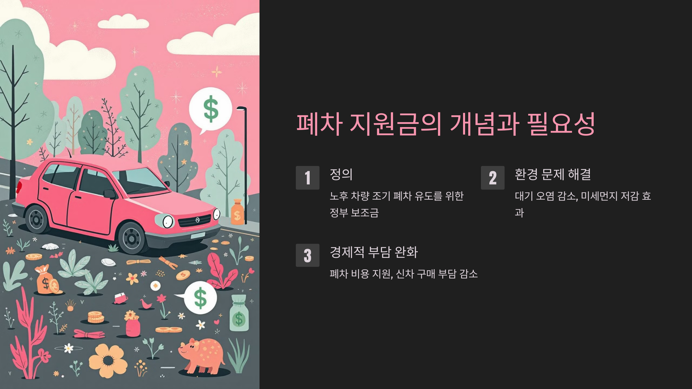 폐차 지원금은 노후 차량의 조기 폐차를 유도하기 위해 정부가 제공하는 경제적 보조금입니다. 이는 대기 오염을 줄이고 교통 안전을 강화하며, 국민들의 경제적 부담을 완화하려는 취지로 마련된 정책입니다. 주요 대상은 오래된 경유차와 디젤 차량으로, 환경 보호를 위한 선제적 조치로 평가받고 있습니다.