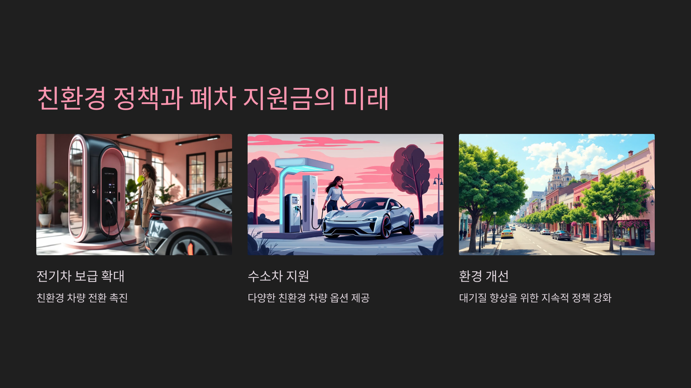 정부는 환경 문제 해결을 위해 폐차 지원금을 지속적으로 확대하고 있으며, 이를 통해 전기차와 수소차 같은 친환경 차량의 보급을 더욱 촉진하고 있습니다. 앞으로도 보다 많은 운전자들이 혜택을 받을 수 있도록 관련 정책은 강화될 전망입니다.